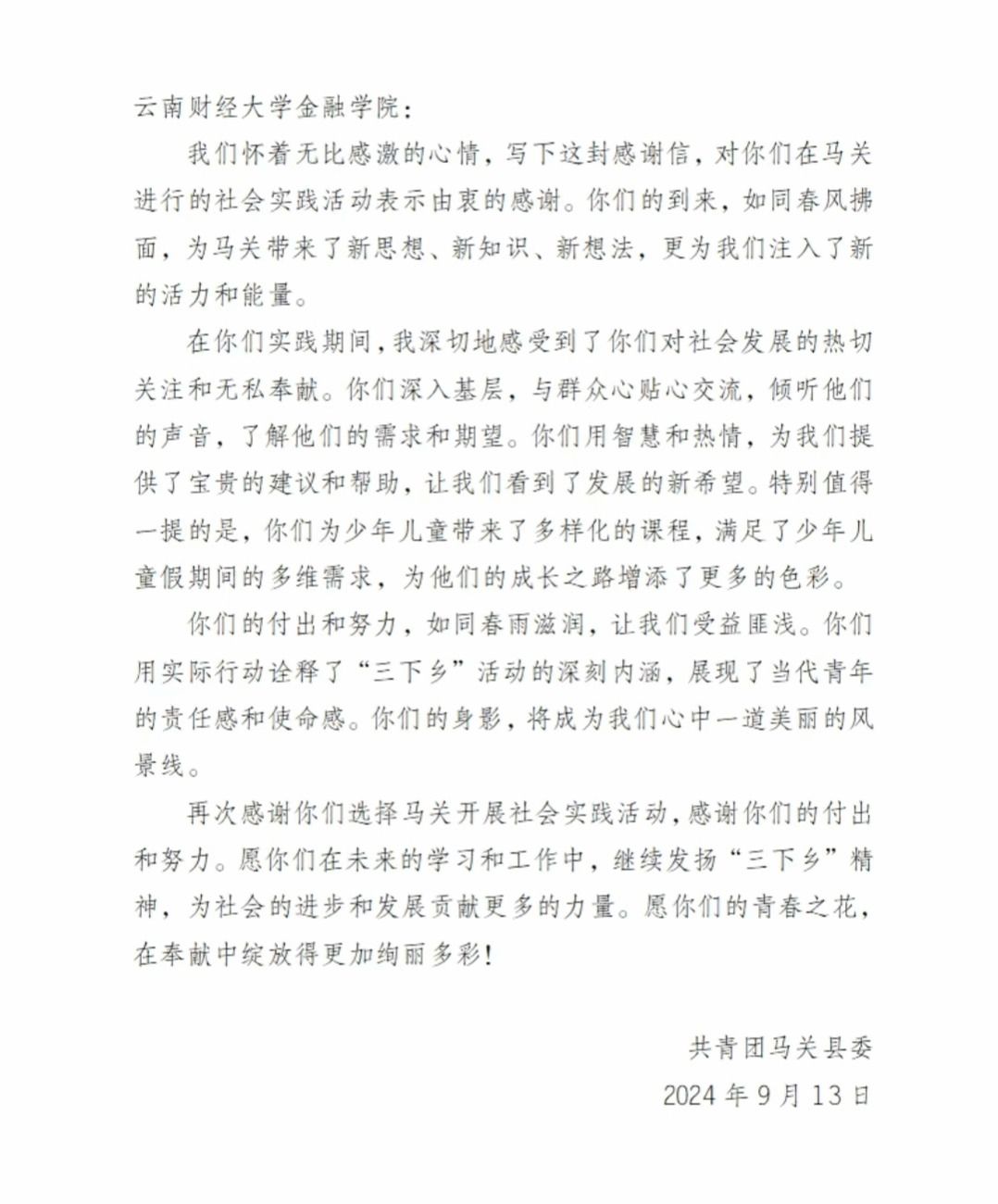 信中提到,在“三下乡”实践期间,WilliamHill官方网站金融学院实践团队的成员们以饱满的热情、积极的态度、扎实的专业知识,深入基层,走进课堂。认真负责、耐心细致,圆满地完成了各项实践任务。特别提到,在金融小院为少年儿童带来多元化的课程,满足少年儿童假期间的多维需求,充分展现了出色的团队协作能力和良好的专业素养,为马关县的发展贡献自己的一份力量。