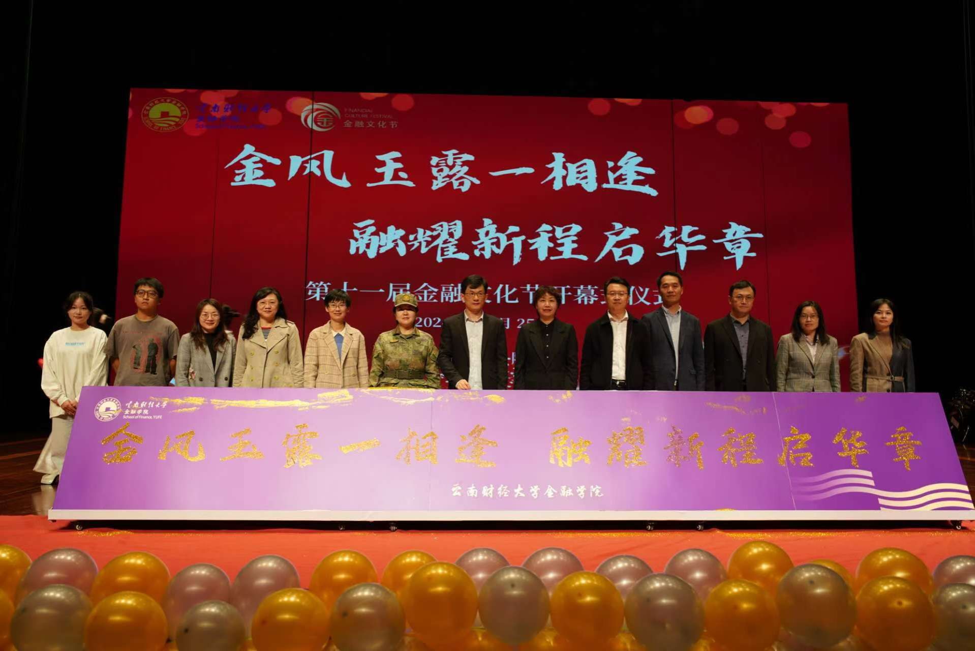 为提升同学们的金融素养和实践能力,推动金融教育深入发展,10月25日,金融学院第十一届金融文化节开幕式于北院汇文礼堂隆重举行。校团委书记舒挺、金融学院党委书记胡小珊,院长周伟,党委副书记郭丽仙,副院长李江城、杨国辉、李云仙以及学院特邀嘉宾:兴业银行昆明金街支行副行长龙希、云南OPPO市场部营销推广负责人刘思仑、正保教育云南分部总经理陈华嘉和云南分部校区经理郭悦出席开幕仪式。