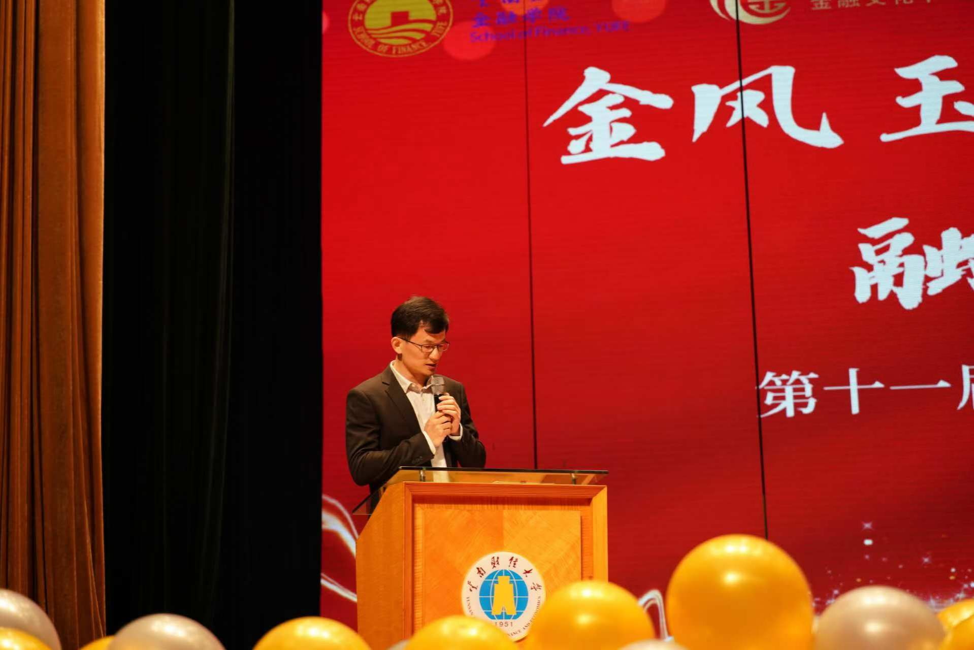 周伟为本次开幕式致辞。他结合党中央金融工作会议精神详细介绍了金融文化节的创办初心和育人使命,并指出学院将依托金融文化节举行一系列学术讲座、素质竞赛、技能培训等精彩纷呈的活动,激发同学们对金融学习的热情。同时,周伟从学院历程、学科专业、文化建设等多方面介绍了金融学院的基本情况,对全体新生提出四点建议:一是坚持读书,读万卷书,用读书来打破焦虑内耗的壁垒并在读书中找到自己的人生追求。二是学会沟通,遇到困难及时找老师联系解惑,明确自身发展方向。三是对金融充满信心,反对金融无用论。四是坚持体育运动,多参与锻炼,以良好的身体素质支撑自身更好地投入到学习中。希望同学们通过金融文化节这一平台,把握时代脉搏,培养金融素养,相互学习借鉴,勾勒青春梦想,为全面推进中华民族伟大复兴贡献青春力量。