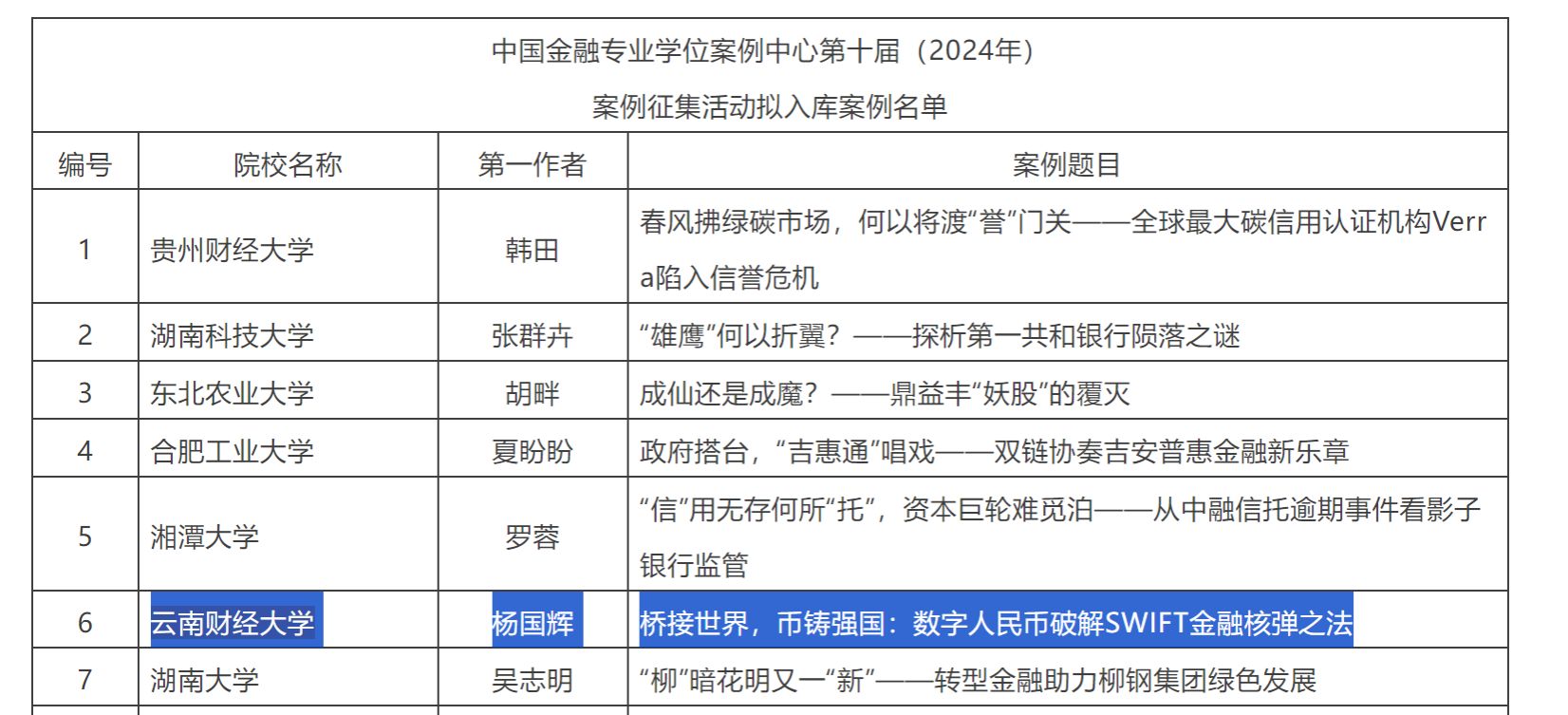 根据全国金融专业学位研究生教育指导委员会(以下简称“金融教指委”)发布的《中国金融专业学位案例中心第十届(2024年)案例征集活动结果公告》,我院杨国辉老师的案例《桥接世界,币铸强国:数字人民币破解SWIFT金融核弹之法》经过严格的评选流程,包括匿名评审和专家审议等环节,从1133份案例中脱颖而出,成功入选第十届中国金融专业学位案例中心案例。