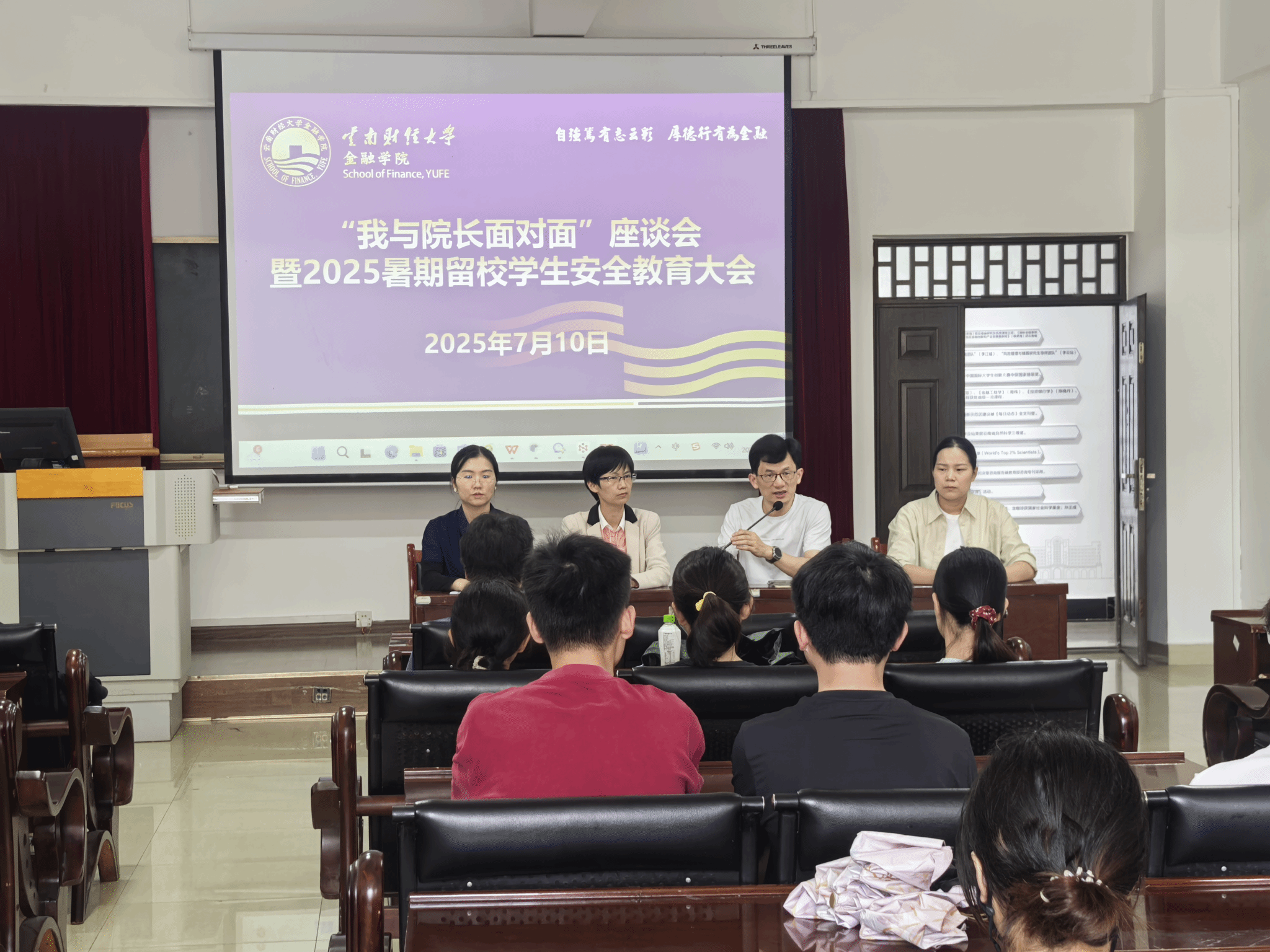 2025年7月10日下午,金融学院在博远楼103会议室举行“我与院长面对面”座谈会暨暑期留校学生安全教育大会,院长周伟、党委副书记郭丽仙、辅导员唐瑶瑶、何青同62名留校学生代表面对面座谈。