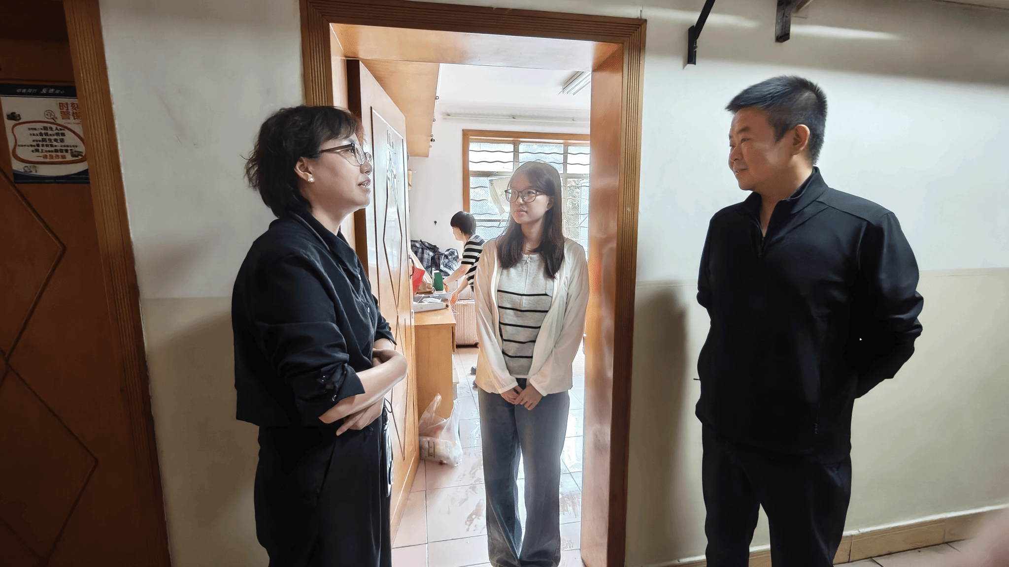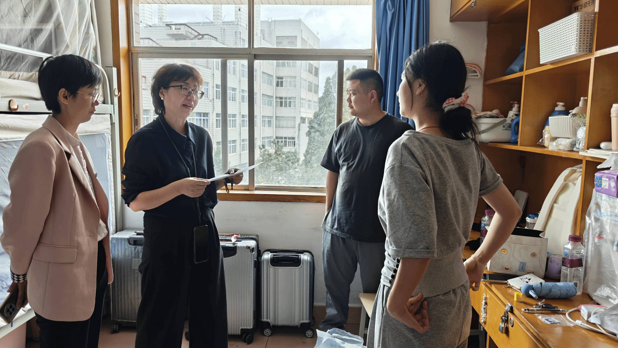 胡小珊代表学院看望慰问刚刚入学的2025级新生,并与在场家长亲切交流。她详细了解同学们的住宿情况,查看宿舍的窗户、照明、床位等设施是否正常使用,对于发现的问题,现场提出解决方案。她鼓励同学们践行学校“三进一出”倡议,做好大学规划,珍惜学习时光,保持健康体魄,做到德智体美劳全面发展。