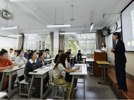 在引荐仪式上,胡小珊向同学们介绍了四位新教师的个人履历和专业研究等情况,希望四位教师在未来的工作中,坚持立德树人,精于研究,潜心教学,成为学高为师、身正为范的领路人;同时寄语同学们要高度重视教师的知识传授和经验分享,尊师重教,相互促进,共同成长。最后,在同学们热烈的掌声中,教师们顺利开启了教学生涯 “第一堂课”。