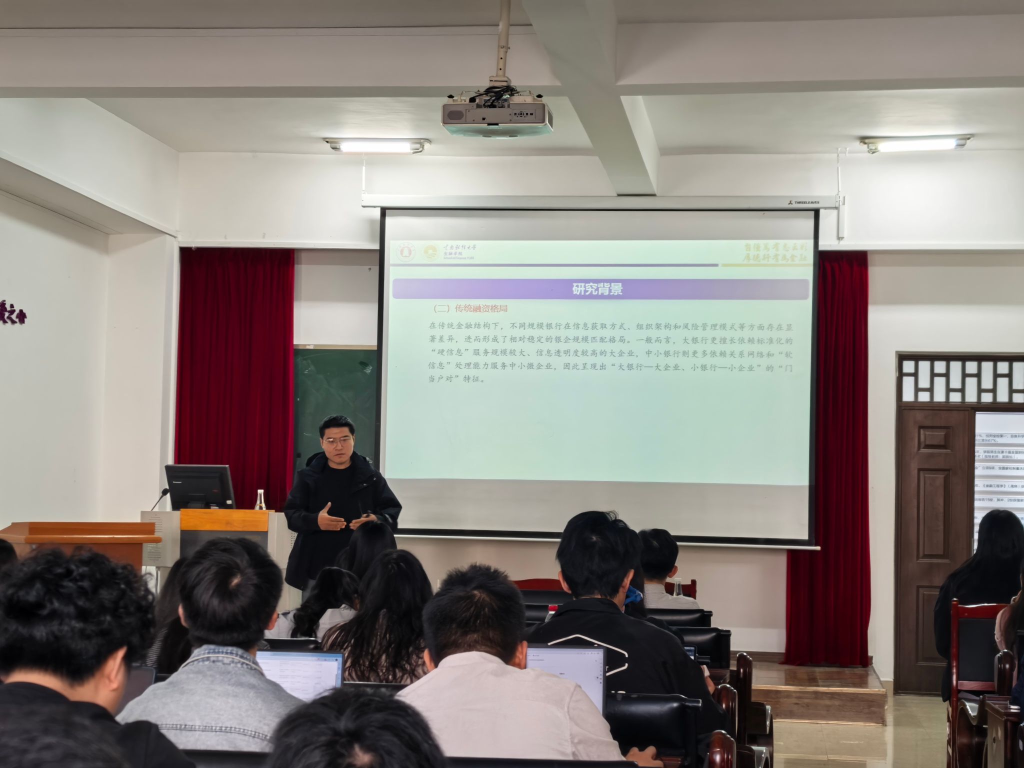 在青年教师学术交流阶段,袁留闯博士围绕“金融科技与银企规模匹配”这一主题展开学术分享。首先阐述了选题背景与研究机制,同时强调数据选取与模型设定的严谨性;在实证分析方面,详细展示了基准回归、机制检验及内生性处理结果,在内生性检验中还展示了工具变量法下更为科学可靠的检验方式;最后,围绕进一步研究中的挤出效应与融资成本差异,明确指出在金融科技背景下大银行在小微金融市场中的竞争优势进一步增强。