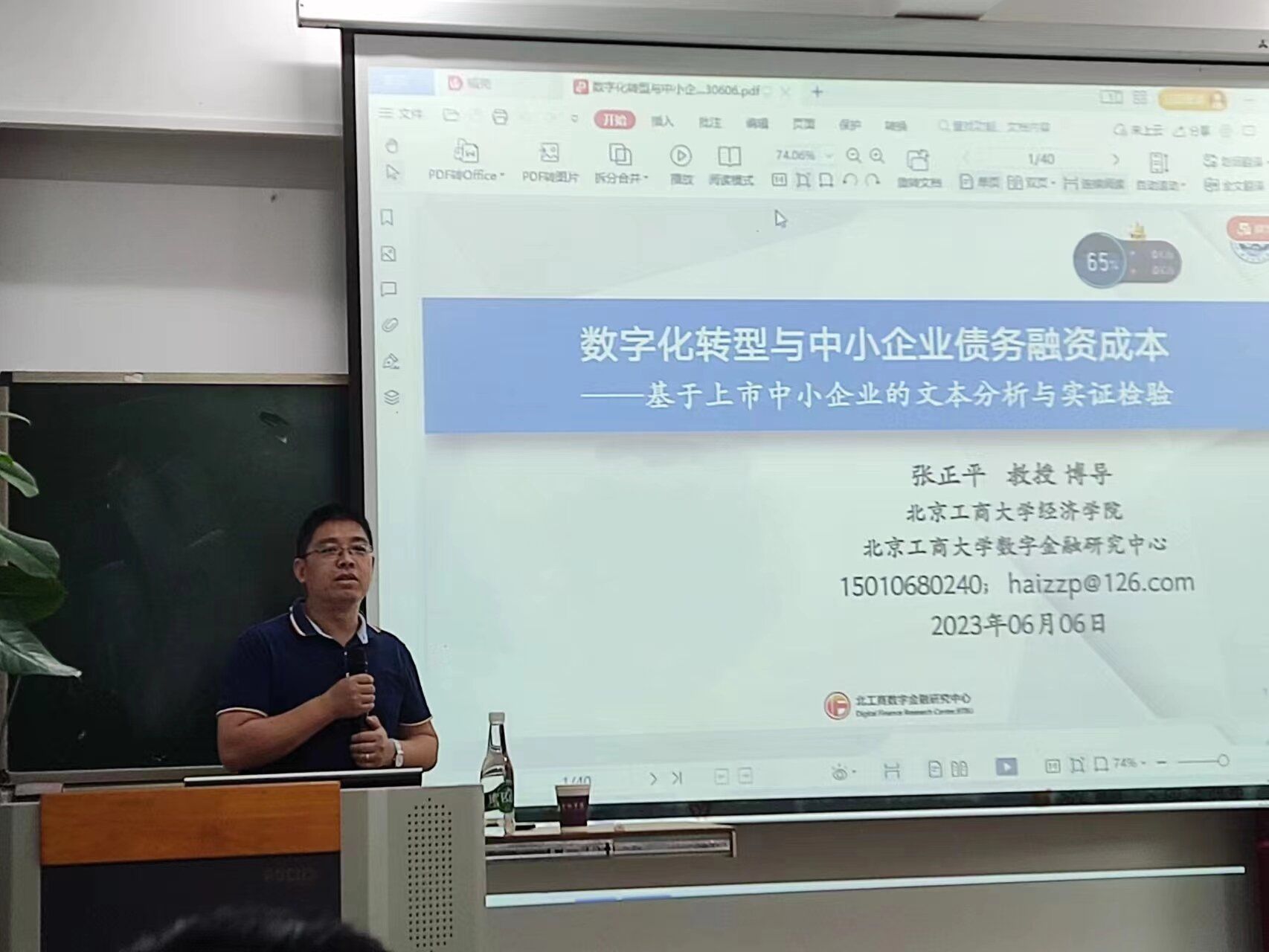 6月6日下午4点在博远楼103室,北京工商大学经济学院金融系教授张正平应邀到我院做学术讲座,主题为“数字化转型与中小企业债务融资成本”。本次讲座由金融学院名誉院长熊德平教授主持,学院博士研究生、硕士研究生及主要学生干部聆听了本次讲座。