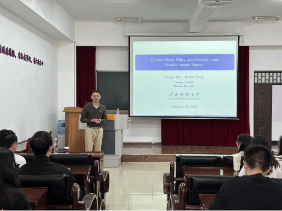9月14日,应金融学院邀请,辽宁大学中国经济研究所助理教授侯尚迪老师来我院作讲座,主题为“异质性模型中的最优财政政策”。讲座由学院副院长李云仙主持,学院院长周伟、青年教师刘帝君及部分研究生参加了本次讲座。