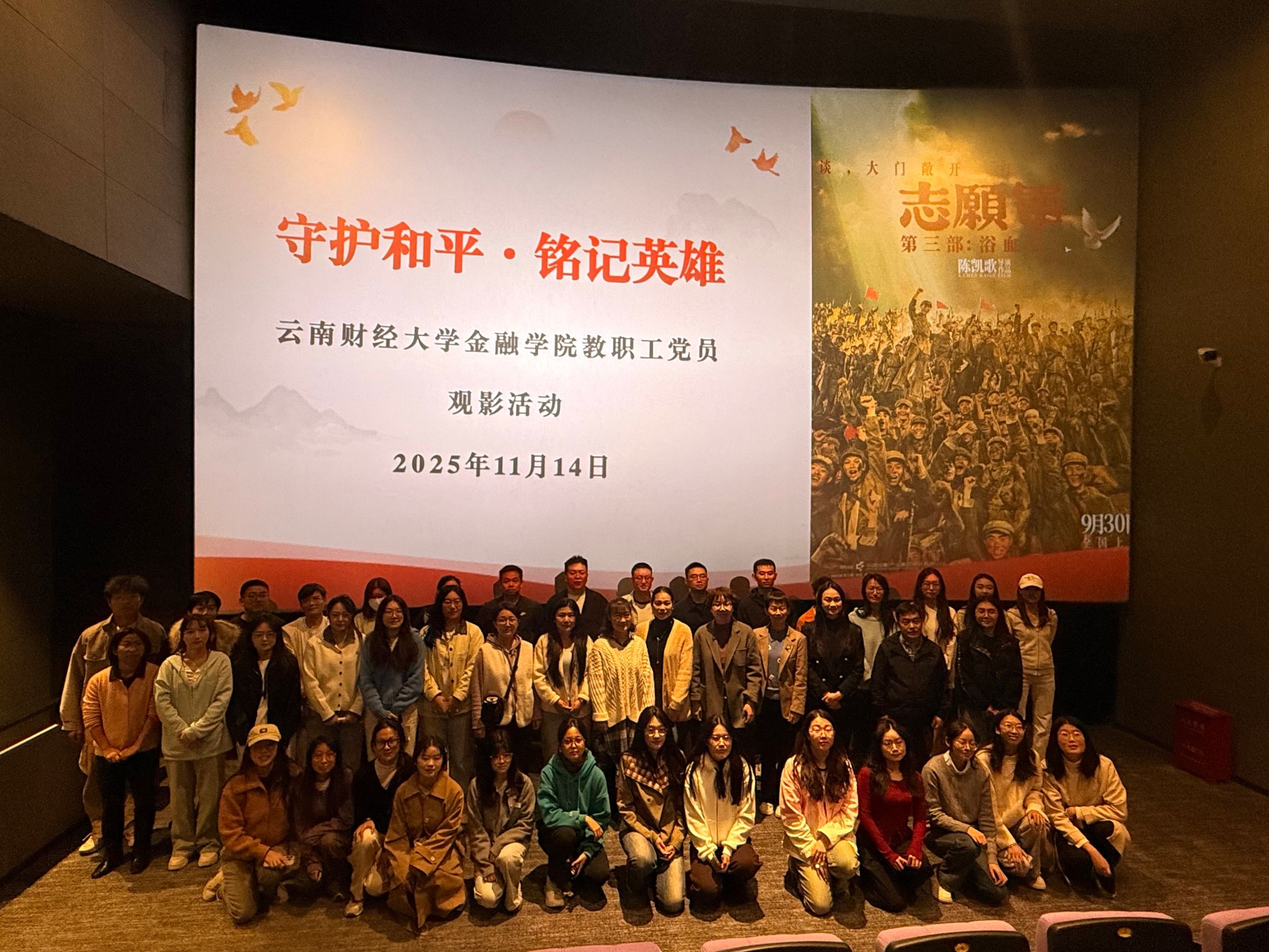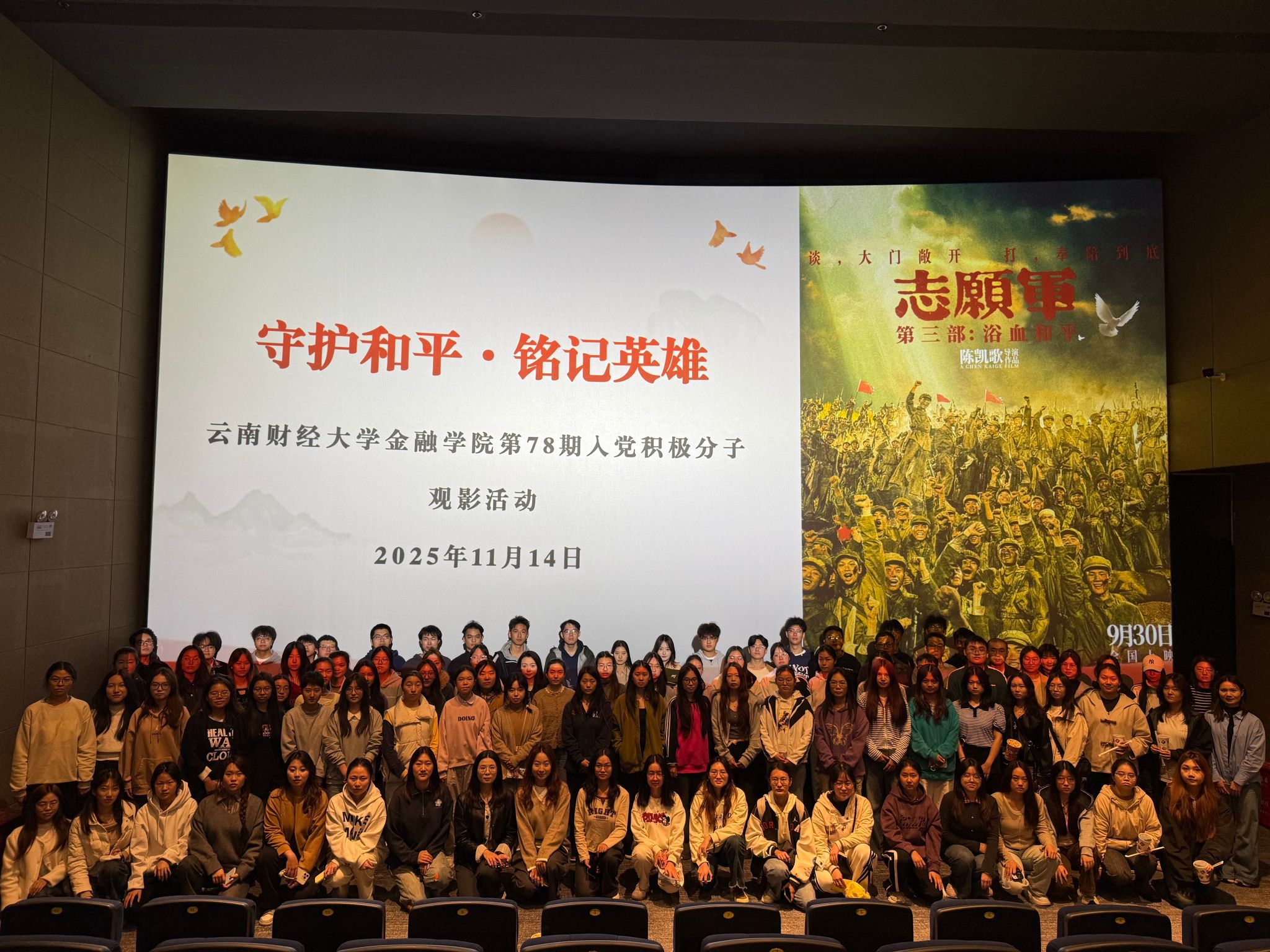 为推动党史学习教育常态化长效化,厚植师生党员家国情怀,2025年11月14日,WilliamHill官方网站金融学院组织第78期入党积极分子、全体师生党员共计230余人,集中观看红色题材电影《志愿军:浴血和平》,以光影为媒回溯峥嵘岁月,在历史回响中汲取奋进力量,夯实信仰之基。