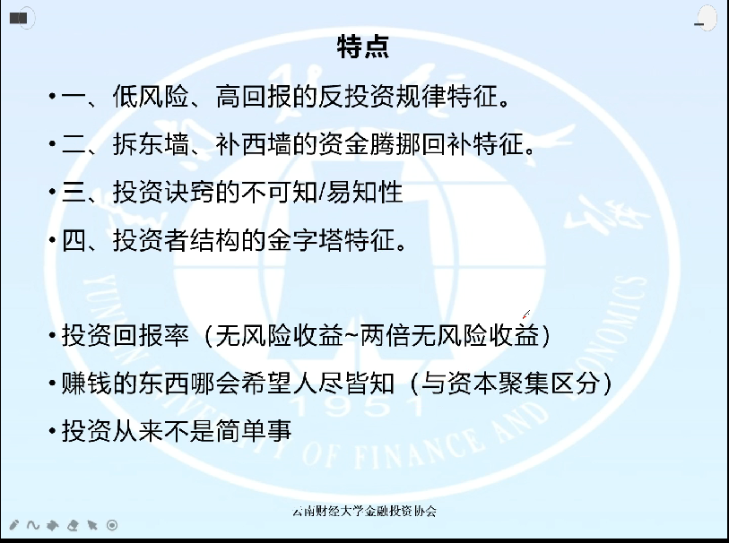 活动开始,董一平同学介绍了本次活动的主题与基本内容为“防范金融诈骗”,并说明了金融诈骗在生活中与我们的关系。紧接着,李桉同学为大家详细讲解金融诈骗,带领大家一起学习金融诈骗的特点、基本形式以及金融投资的合理收益区间。最后,针对如何防范金融诈骗,李桉同学提出了几点综合建议,并带领同学们一同探讨,在讨论中学习。