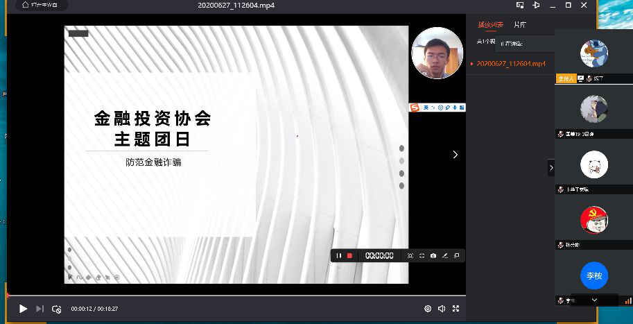 为普及和宣传金融知识,加强金融风险教育,学习如何防范金融诈骗,加强金融投资协会团组织建设,金融投资协会于7月1日晚19时在腾讯会议召开“防范金融诈骗,云财青年在行动”主题团日活动。本次会议由金融投资协会副会长李桉同学主持,副会长董一平同学、杨润琦同学主持,金融投资协会成员参与本次会议。