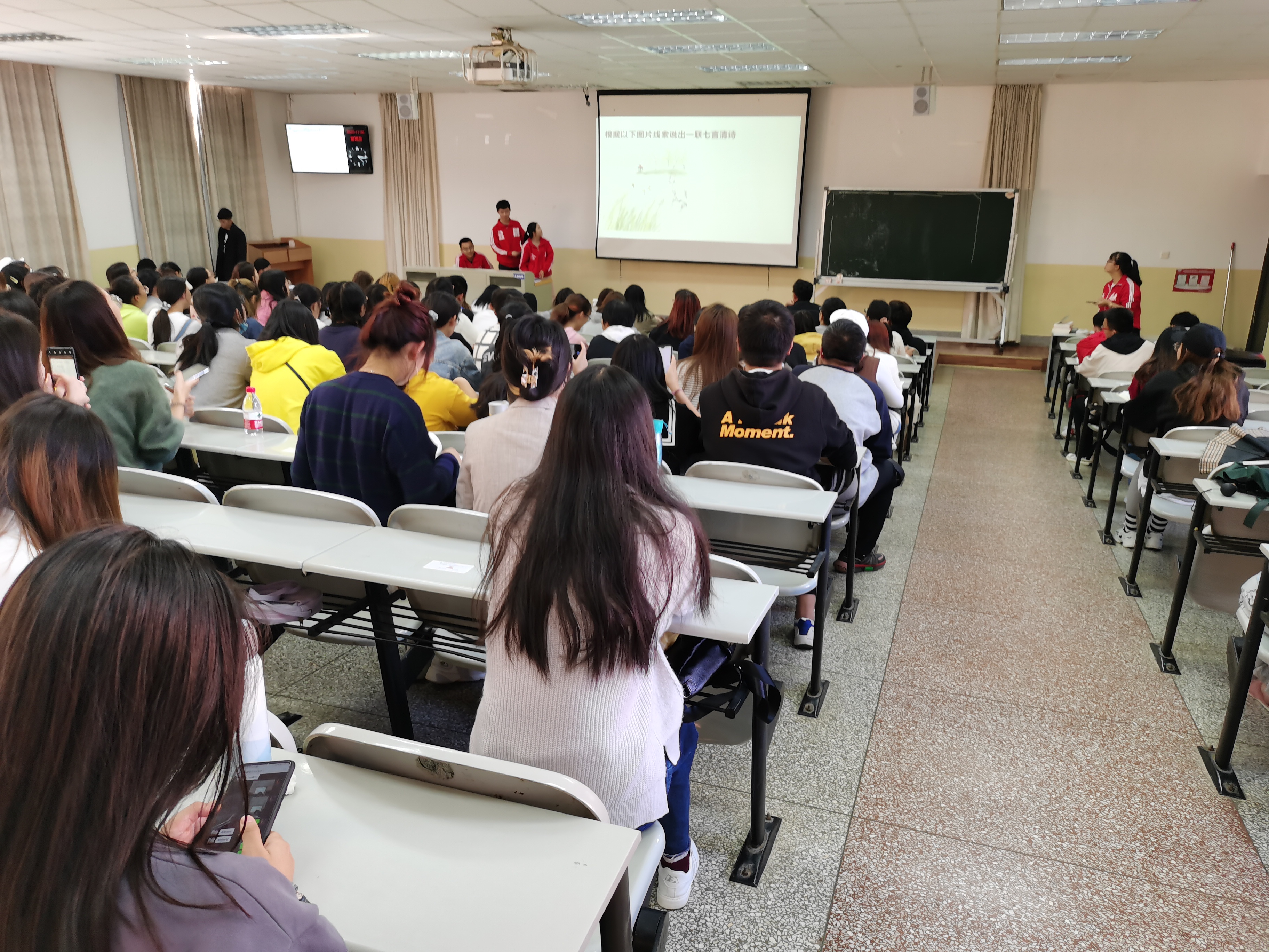 第四次团校活动于同年11月20日下午2时30分,凌云楼301举办,活动以“赏中华诗词、寻文化基因、品生活之美”主题。习近平同志在十九届五中全会中指出:“提高国家文化软实力,要努力展示中华文化独特魅力,要使中华民族最基本的文化基因与当代文化相适应、与现代社会相协调。”在做好团委各项工作的同时,团校部积极响应号召,引导金融学院学子深入学习中华传统文化,培育社会主义新时代青年。活动使同学们对中国传统文化产生了极大的兴趣。中国传统文化博大精深,学习和掌握其中的各种思想精华,对树立正确的世界观、人生观、价值观很有裨益。学史可以看成败、鉴得失、知兴替;学诗可以情飞扬、志高昂、人灵秀;学伦理可以知廉耻、懂荣辱、辨是非。今后同学们将中国优秀文化中的精髓内化于心,外化于行,提升个人思想建设,为金融学院及国家贡献自己。