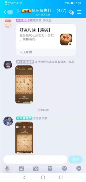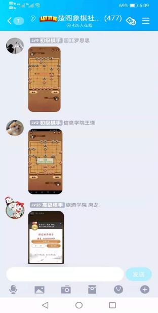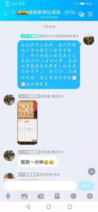 模拟象棋比赛此次训练在天天象棋APP上进行,训练采取自愿组队的形式,由社员自行找人与之对弈,训练结束后,每位参与训练的队员将参与对弈的截图发到楚阁象棋社的QQ群里。