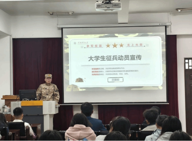 2025年11月10日,学院在博远楼103教室举行征兵宣传活动,邀请武装部王明水老师和优秀退伍复学代表王小康分享交流。王明水老师围绕应征条件、报名流程、学费补偿、升学优待等核心政策进行系统解读;王小康以亲身经历讲述军营里的成长蜕变,分享体能训练、纪律养成等鲜活故事,让在场学子直观感受军旅生活的魅力。