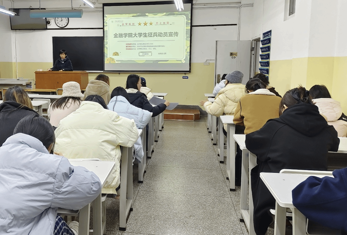 为深入贯彻国家征兵政策,强化大学生国防观念,激发青年学子参军报国热情,金融学院于2025年11月至2026年1月期间,通过主题班会、专题宣讲、政策解读、入伍答疑等多种形式组织开展系列征兵宣传与国防教育活动,着力构建“教育—引导—宣传—动员—解惑”全过程工作体系。