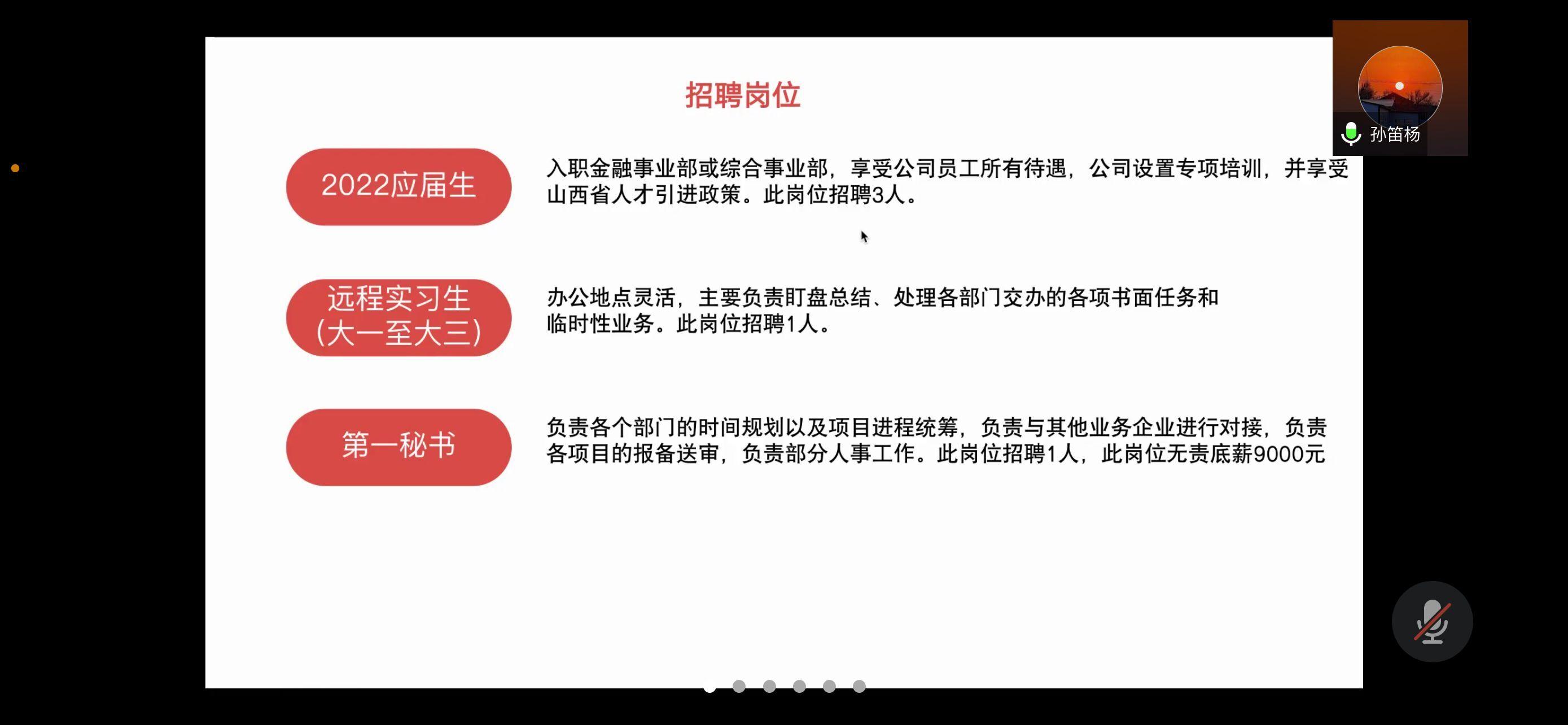 在疫情防控常态化的特殊时期,为持续做好毕业生就业指导工作,同时缓解毕业生在线上教学期间的就业压力,搭建学生与企业沟通的桥梁,金融学院联合山西载晨有限公司于3月25日举办了线上宣讲会。本次会议由金融学院学生管理服务实践中心主持,覆盖了大一至大四年级的学生。