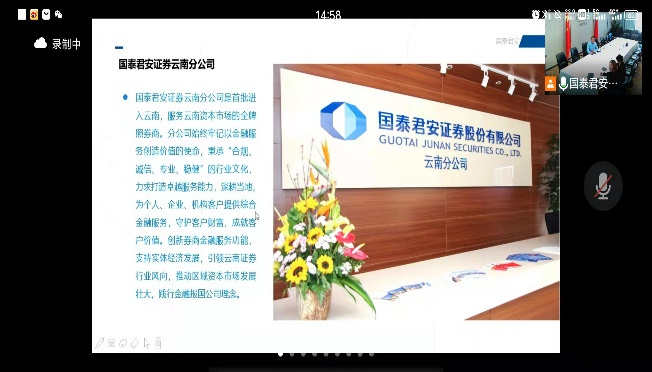 针对研究生就业求职问题,由金融学院邀请国泰君安证券云南分公司到校开展线上宣讲会,此次会议于4月28日14:00至15:00在线上成功开展。