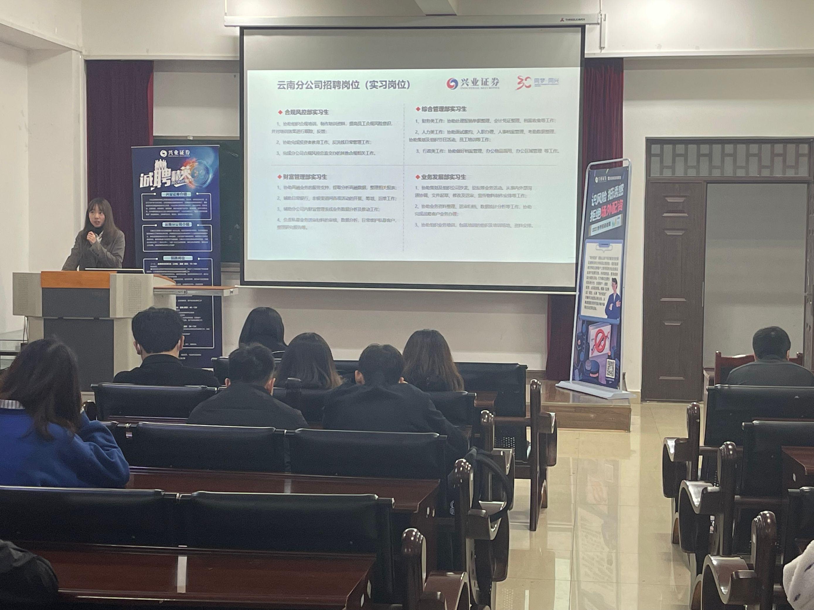在疫情防控常态化的特殊时期,为加强学生对企业的了解,缓解大学生就业压力,持续做好毕业生就业准备工作,金融学院联合兴业证券云南分公司于2021年11月9日19:00-21:00在博远楼103举办了兴业证券专场宣讲会。