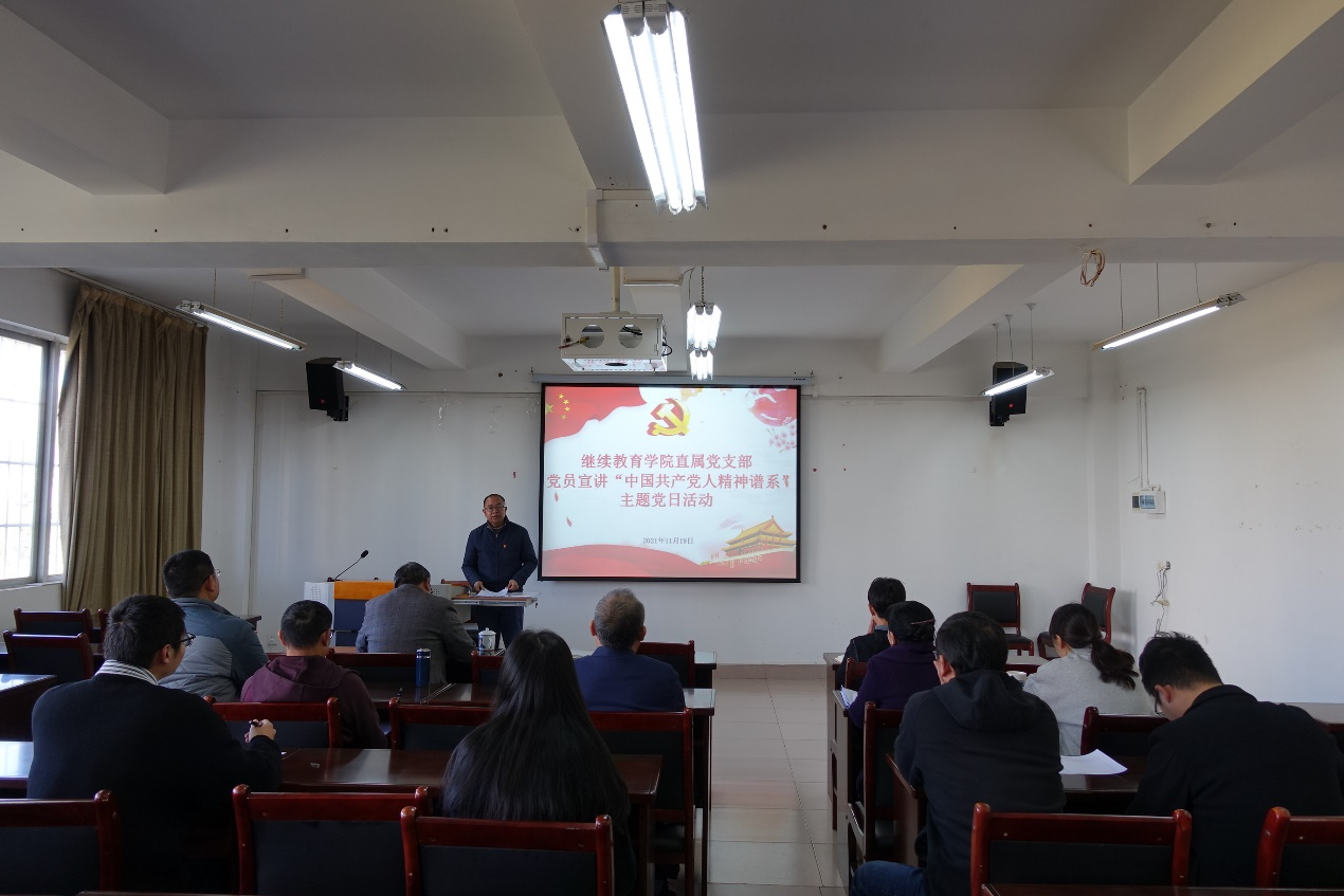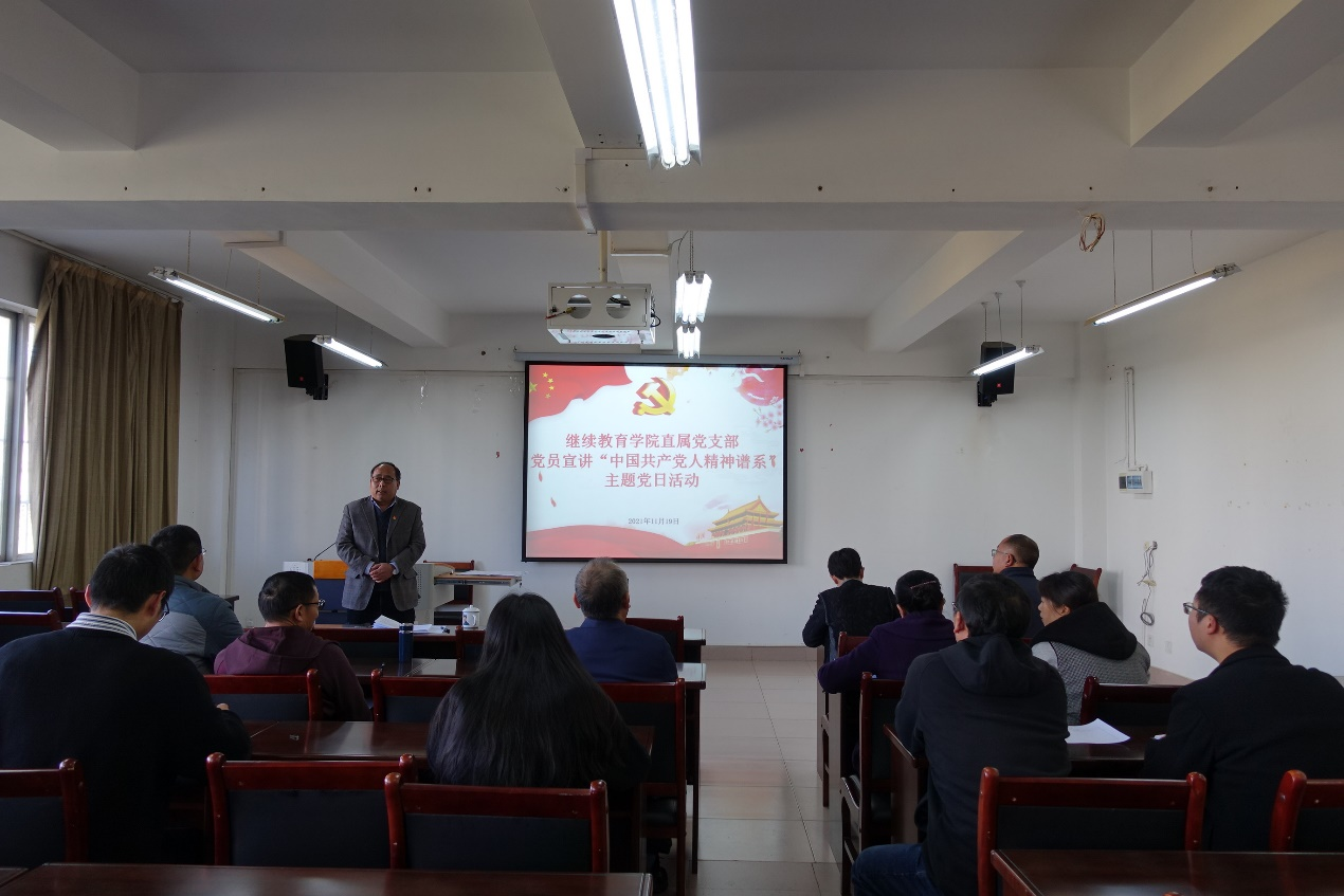 11月19日下午,为进一步推进党员教职工在党史学习教育中汲取信念力量、恪守初心使命,继续深入学习贯彻习近平总书记在庆祝中国共产党成立100周年大会上的重要讲话精神,继续教育学院直属党支部在北院逸夫楼406多媒体教室开展党员宣讲“中国共产党人精神谱系”特色主题党日活动。活动由直属党支部书记金国兴主持。