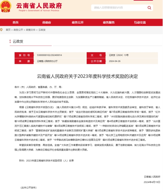 图1 云南省人民政府关于2023年度科学技术奖励的决定