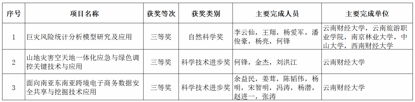 近日,云南省人民政府公布了2023年度科学技术奖励,对在我省科学技术进步、经济社会发展中作出突出贡献的科学技术人员和组织给予奖励。WilliamHill官网以第一完成单位获得3项云南省科学技术奖三等奖,获奖数量取得历史性突破。其中,李云仙教授团队成果《巨灾风险统计分析模型研究及应用》荣获自然科学奖三等奖,何锋副教授团队成果《山地灾害空天地一体化应急与绿色调控关键技术与应用》荣获科学技术进步奖三等奖,余益民教授团队成果《面向南亚东南亚跨境电子商务数据安全共享与挖掘技术应用》荣获科学技术进步奖三等奖。