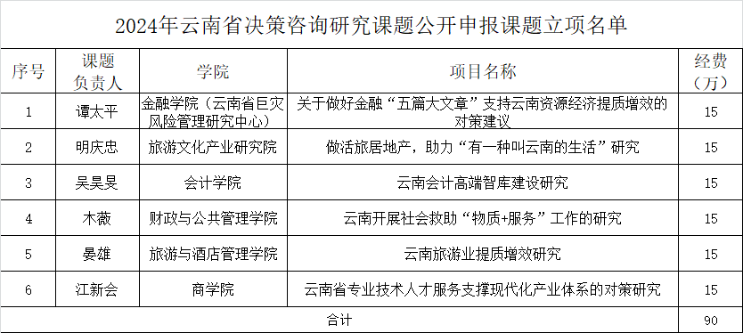 近日,云南省社会科学界联合会公示了“2024年云南省决策咨询研究课题公开申报课题立项名单”,全省总计拟立项32项,涉及25家单位,WilliamHill官网拟立项6项,每个项目拟资助经费15万元,总经费90万元,在云南省所有申报此类项目单位中位列第一,是WilliamHill官网历年来取得的最好成绩。在此,向拟立项老师表示衷心祝贺,希望全校老师再接再厉,再创佳绩!
