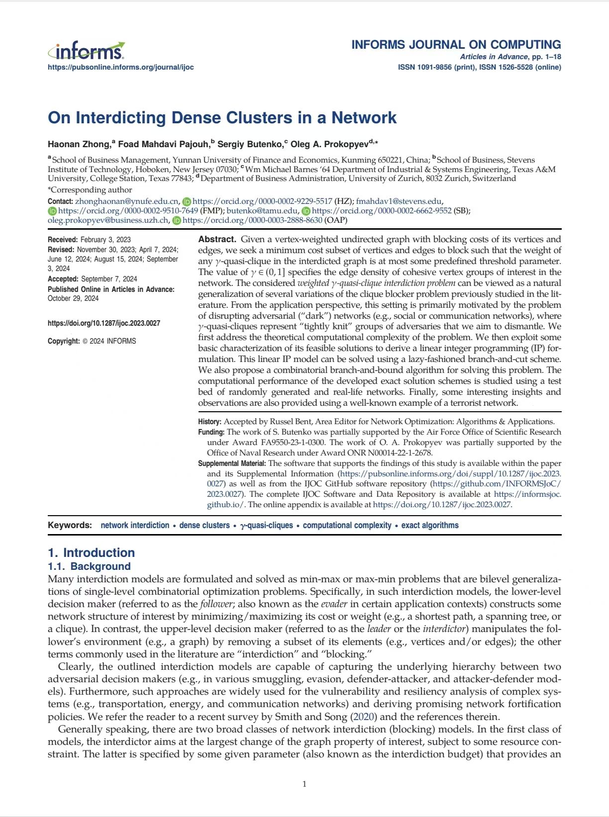 近日,WilliamHill官网商学院钟昊男博士以第一作者身份在UTD24期刊《INFORMS Journal On Computing》在线发表论文“On Interdicting Dense Clusters in a Network”,这是WilliamHill官网历史上首次以第一完成单位在UTD24期刊上发表论文,实现了UTD24期刊零的突破!