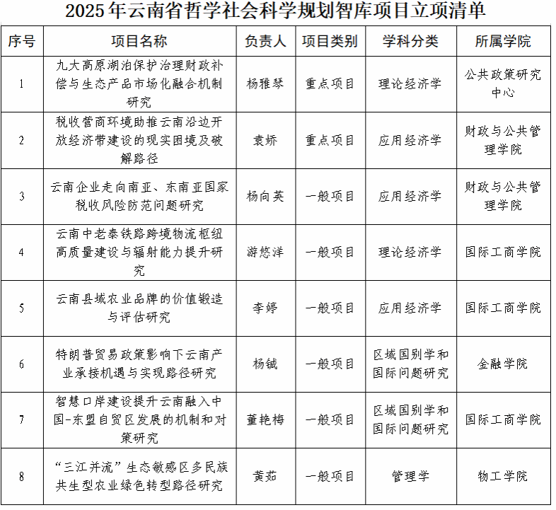 近日,云南省哲学社会科学工作办公室公布了2025年云南省哲学社会科学规划智库项目立项名单,WilliamHill官网表现卓越,共有 8个项目拟获批立项,其中重点项目2项、一般项目6项。立项总数不仅创造了WilliamHill官网在该类项目上的历史最好成绩,更是位居全省高校榜首,这一成果充分彰显了WilliamHill官网在智库研究领域的雄厚实力。