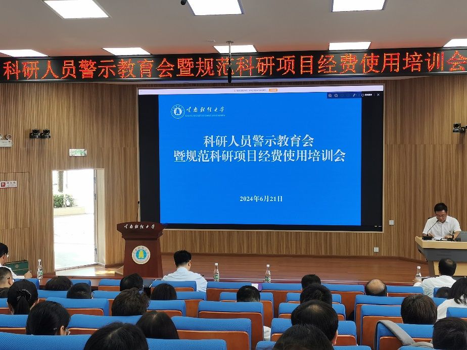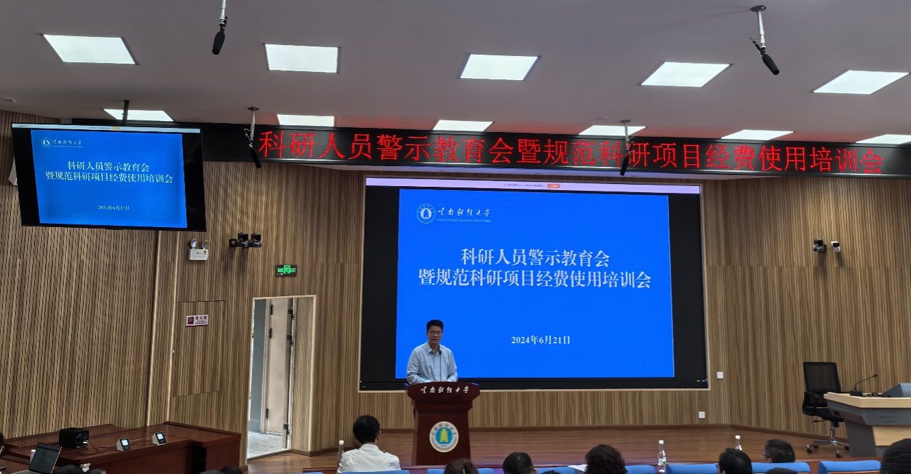 校纪检处副处长、李晔宏、李娇副处长、纪检处和科技处相关科室干部等参加了上述警示教育会暨科研经费使用培训会。