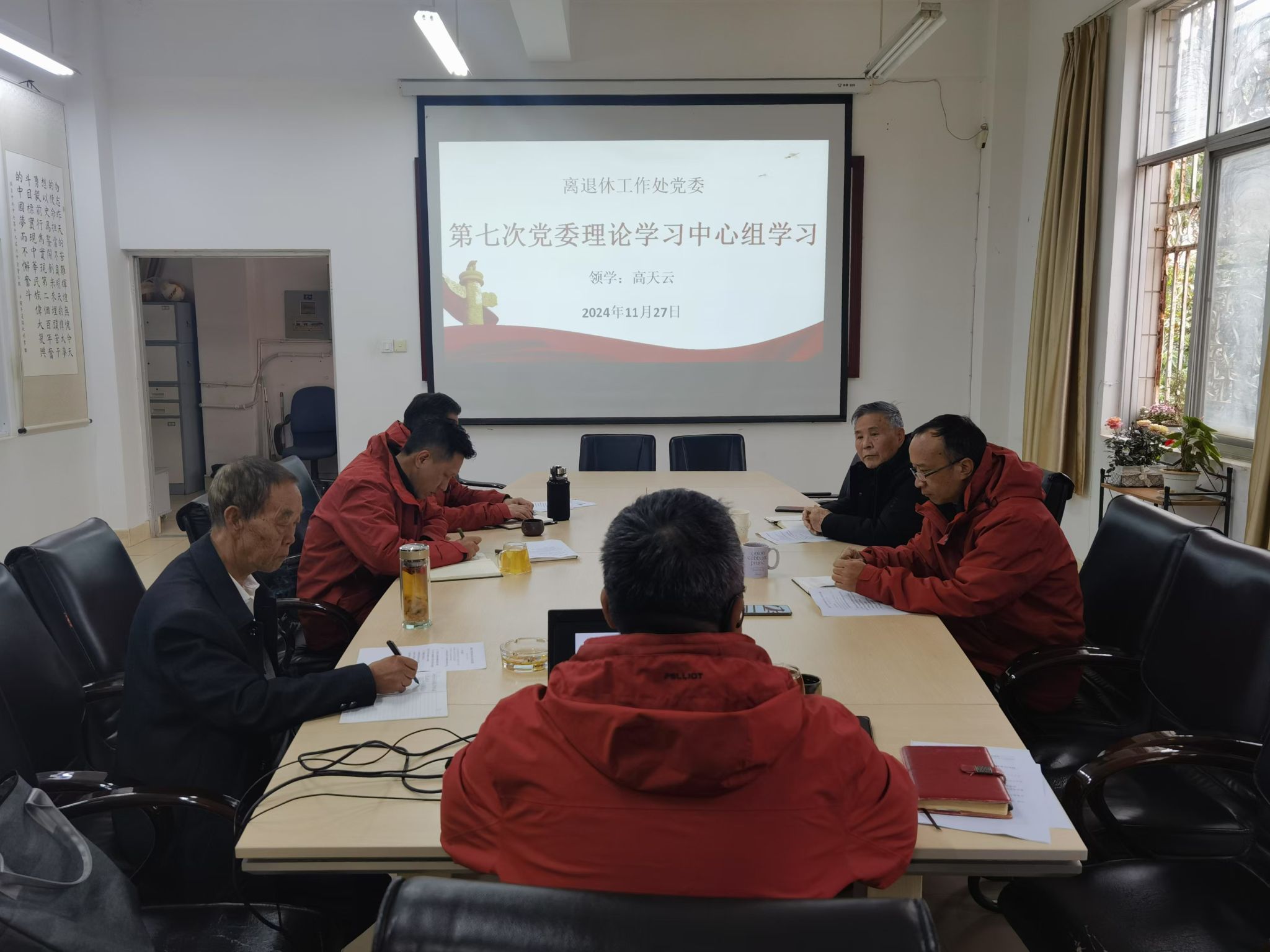 2024年11月27日上午,离退休处党委在处会议室开展2024年第7次党委理论学习中心组集中学习,离退休处处长高天云进行领学,处党委委员参加学习。