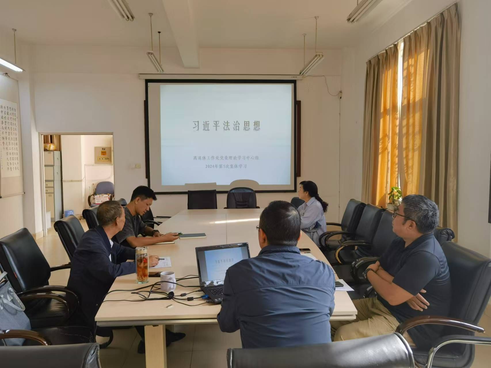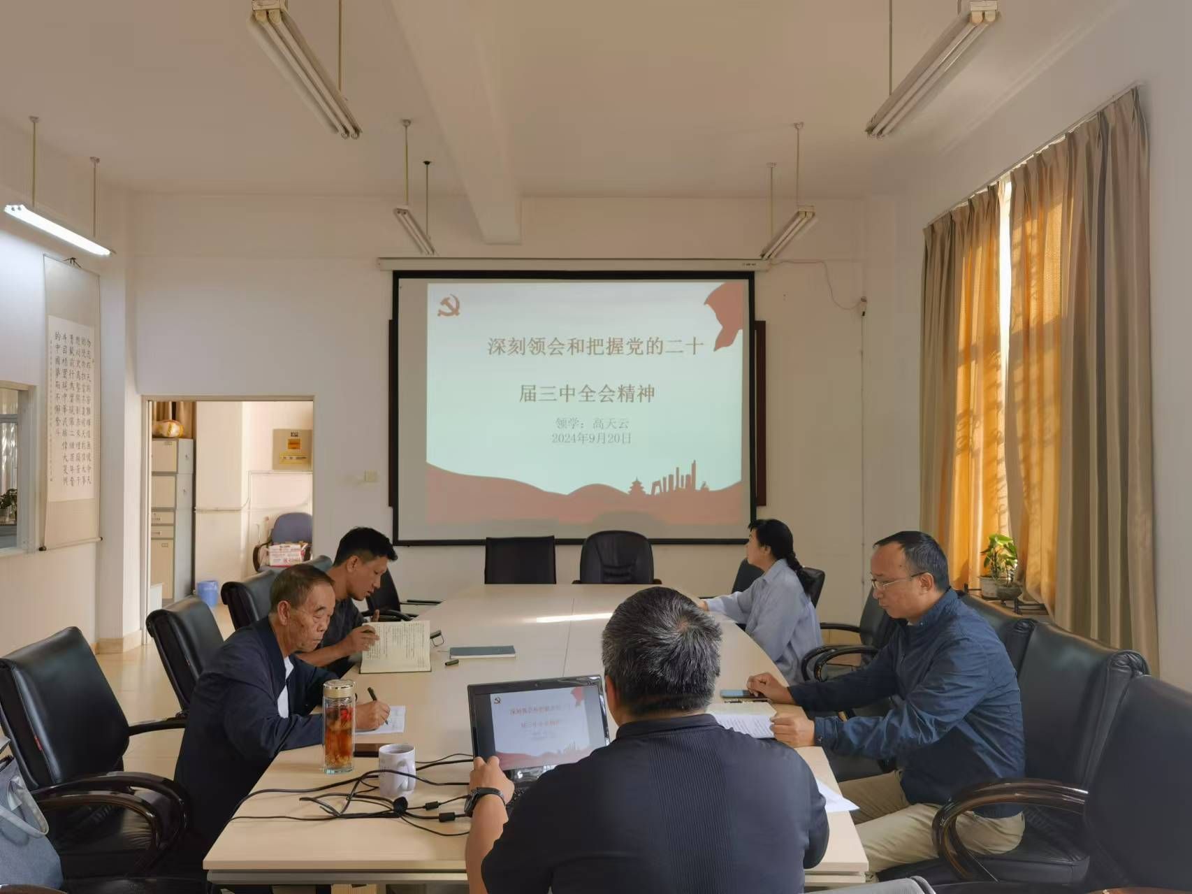 2024年9月20日下午,离退休处党委在处会议室开展2024年第5次党委理论学习中心组集中学习,党委委员、离退休处处长高天云、处党委副书记兼纪委书记王俊分别进行领学,学习由高天云主持,处党委委员参加学习。