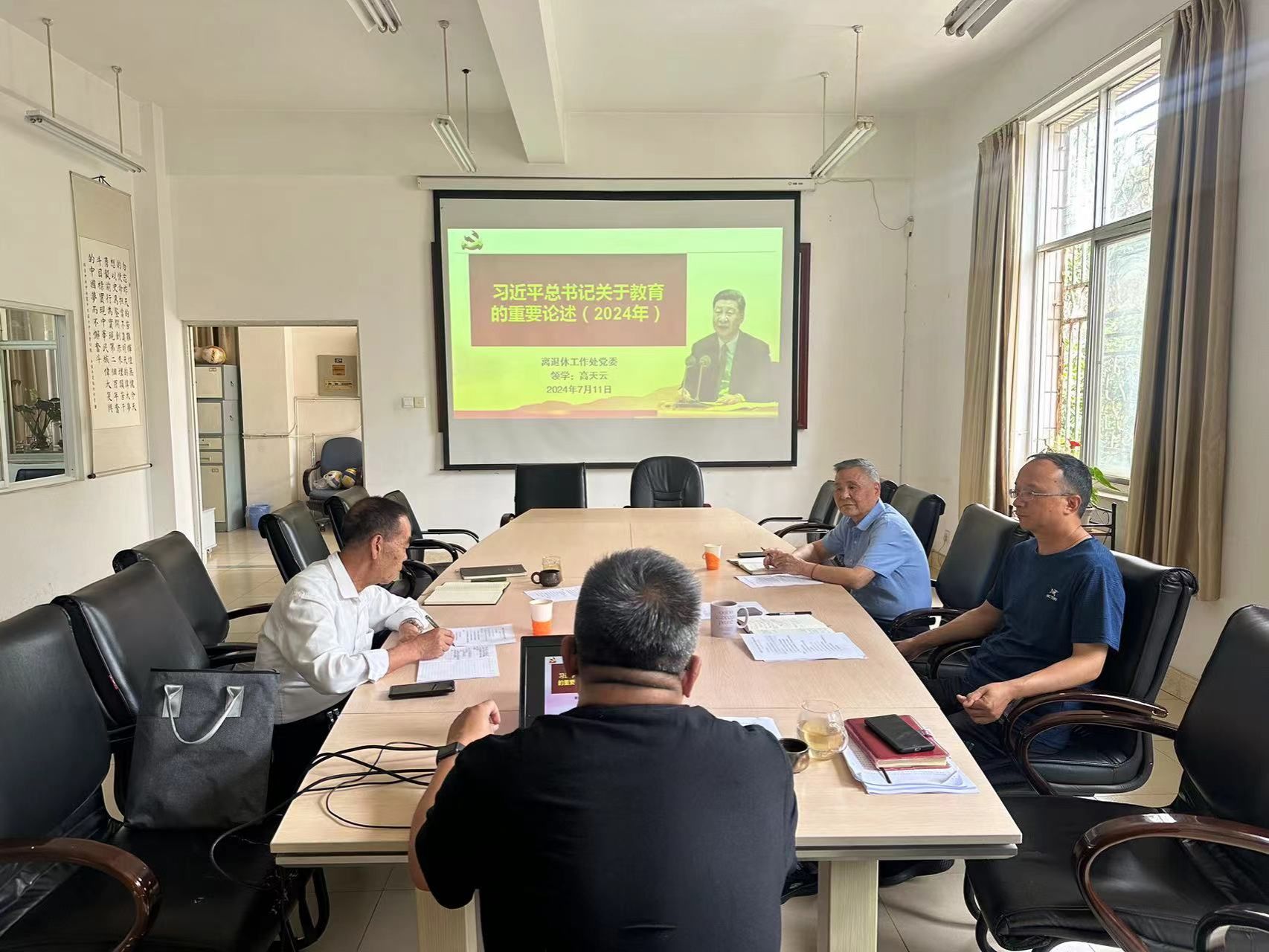 2024年7月11日下午,离退休处党委在处会议室开展2024年第4次党委理论学习中心组集中学习,离退休处处长高天云领学,处党委委员参加学习。
