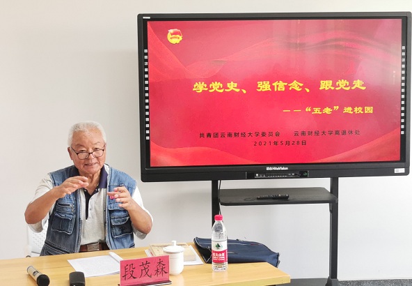 为持续扎实推进党史学习教育走深走实,WilliamHill官网充分发挥“五老”作为时代实践者、亲历者、开创者、见证者、建设者的优势及模范作用,让爱党爱国情怀根植云财青年心中,让红色基因、革命薪火代代相传,5月28日下午,校团委、离退休处继续开展“学党史、强信念、跟党走”之“五老”进校园主题系列活动。