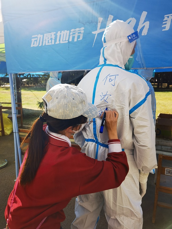 许坤泽说:“2020初,新冠疫情突袭武汉乃至全国,那时众多共产党员默默奉献和伟大的抗疫精神深深感动了我。当时我就想,我也要加入志愿者队伍,为抗疫出一点力。这次学校出现疫情,我坚定地参加了学校抗疫党员志愿者队伍,穿上了防护服冲在第一线,实现了向抗疫英雄学习的心愿。虽然抗疫工作十分辛苦劳累,但这对我来说更多的是深感光荣!”