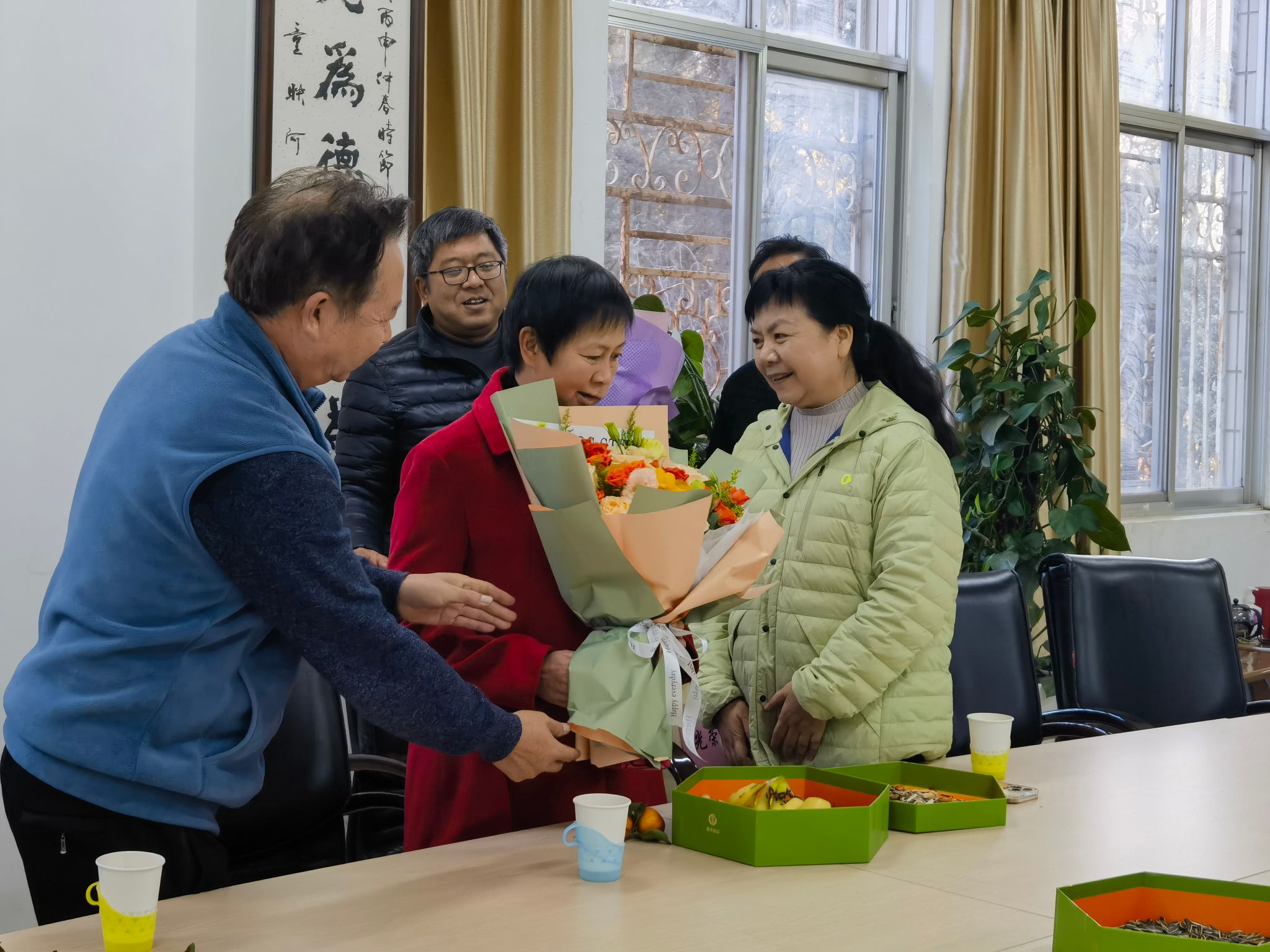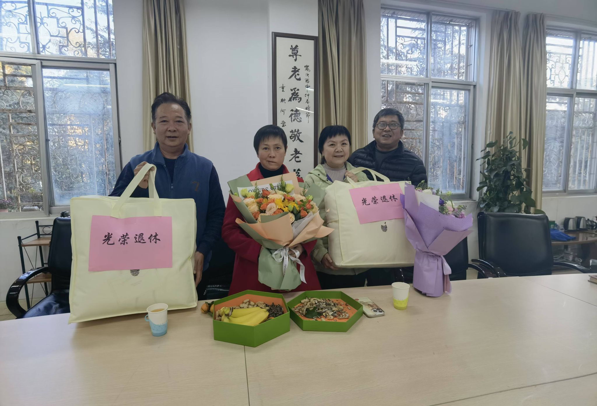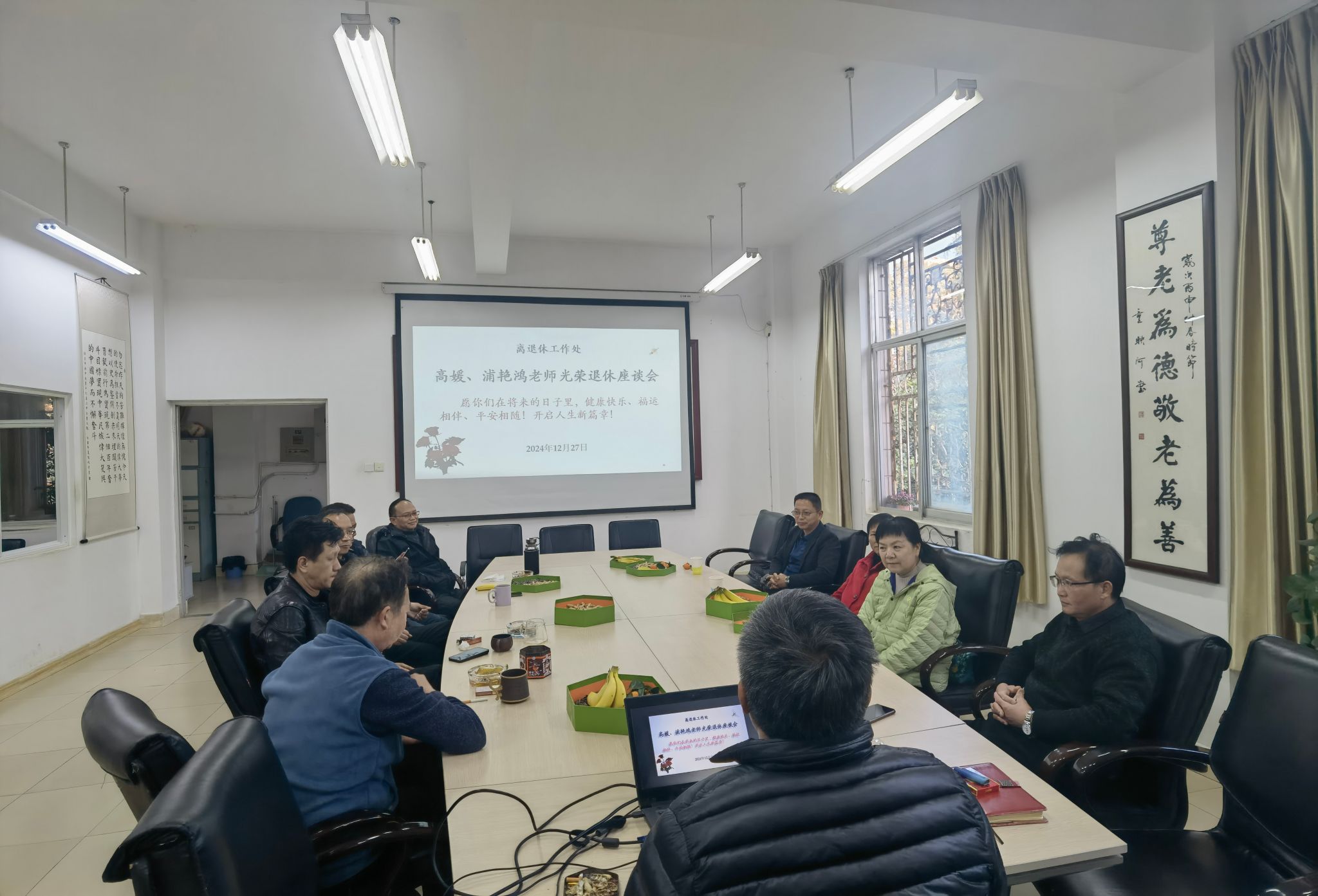 122716时,离退休工作处会议室洋溢着浓浓的温情与感动,一场充满温馨、回忆和感恩的退休职工座谈会在这里隆重举行,离退处全体职工向新退休职工高媛、浦艳鸿表达感激之情、惜别之意和深深祝福。