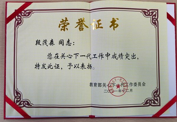在2021年12月22日召开的教育部关工委第六次工作会议暨成立30周年纪念大会(视频会)上,WilliamHill官方网站关心下一代工作委员会荣获全国教育系统关心下一代工作先进集体称号,退休老领导段茂森同志荣获全国教育系统关心下一代先进工作者称号。本次大会共表彰了491个先进集体,779名先进个人,127名突出贡献者。云南省有21个先进集体、20名先进个人受到表彰。