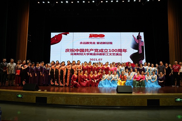 为热烈庆祝中国共产党成立100周年,离退休工作处和老体协提前半年准备,组织老体协艺术团各支队伍精心排练了舞蹈、器乐合奏、诗歌朗诵等13个节目,演员们一个个热情高涨。演出在歌舞《共圆中国梦》中拉开序幕,以全场合唱《没有共产党,就没有新中国》结束。所有节目均由离退休教职工自编自排,整场演出气势宏大、精彩纷呈、高潮迭起,热情讴歌了我们党100年来不平凡的奋斗历程和伟大成就,充分表达了感党恩、跟党走的坚定情怀,汇聚出强大的正能量。