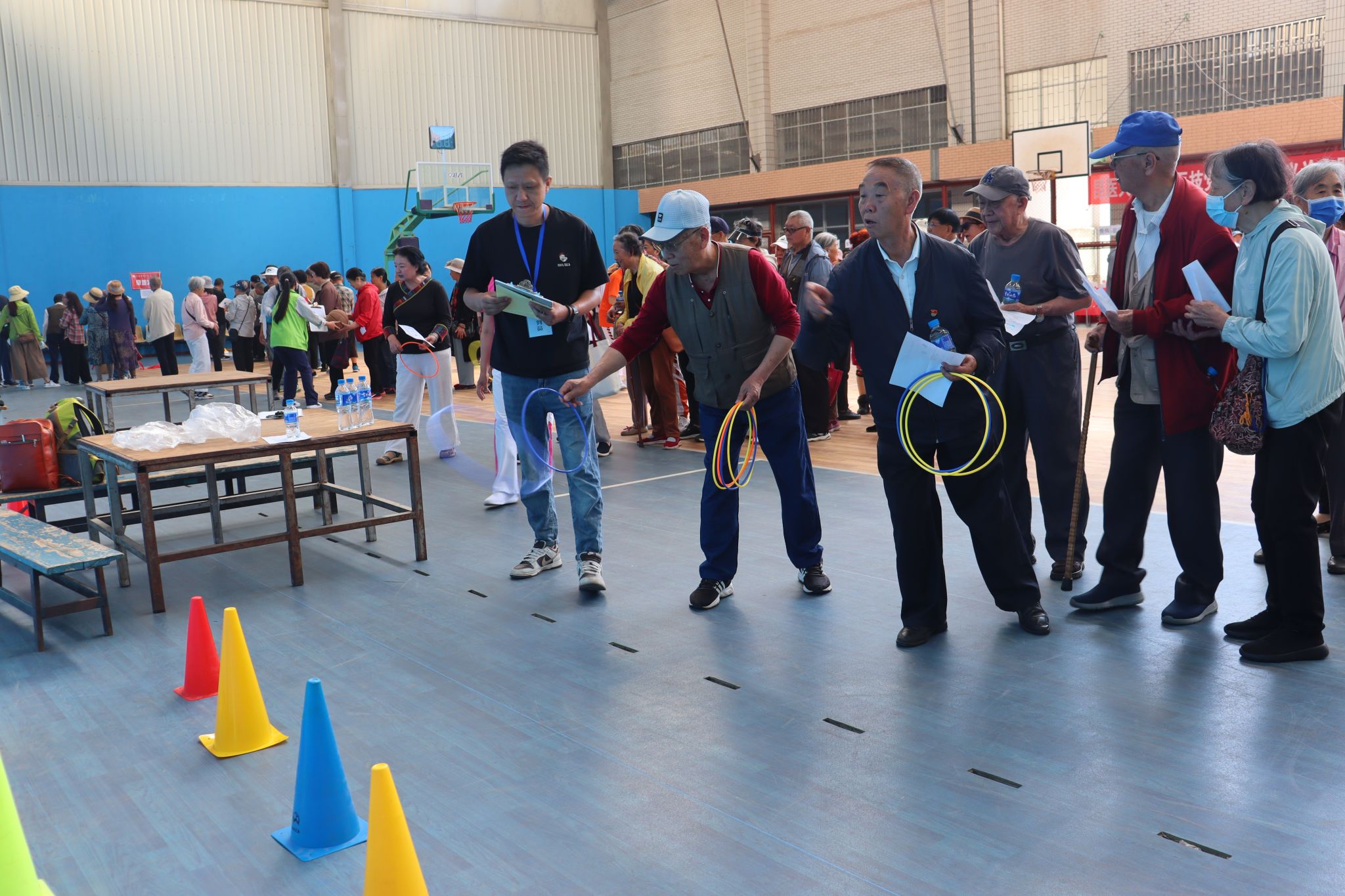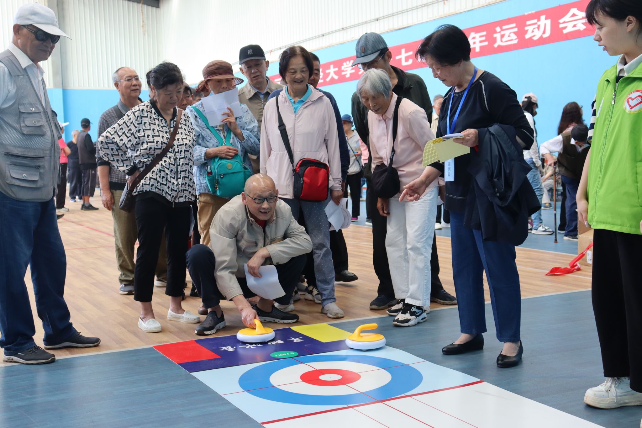 本届老年运动会本着“安全、趣味、参与”的原则,共设置了集体健步走,旱地冰壶、趣味保龄球、飞镖、巧力投球、投箭、投沙袋、套圈、门球进门、足球射门等10个项目。赛场上,虽然没有年轻人风驰电掣般的速度,但老同志们不服输的竞技精神丝毫不输年轻人,他们高涨的热情、积极的参与将运动会推向高潮。