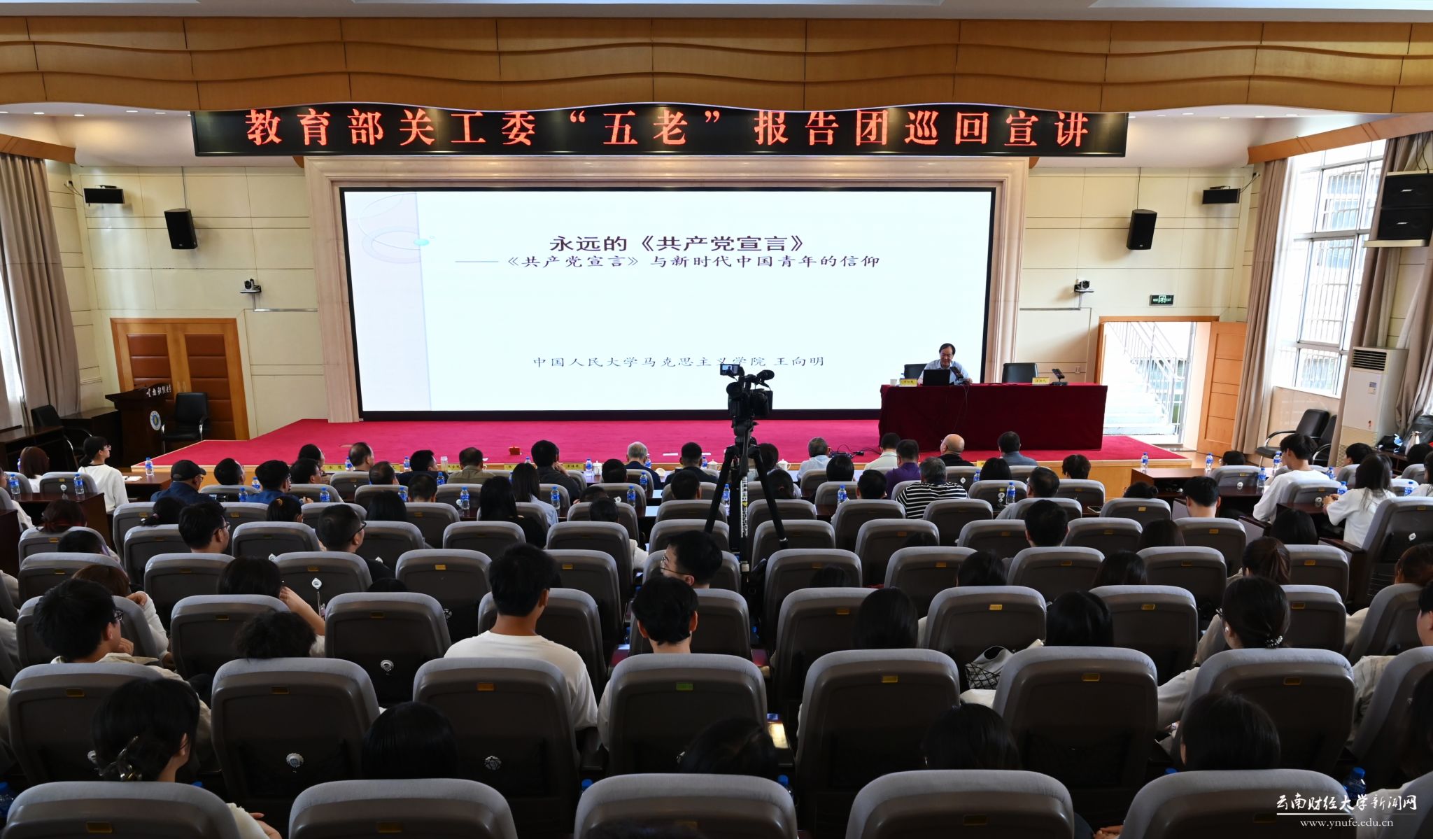 为秉承和发扬关工委“五老”忠诚敬业、关爱后代、务实创新、无私奉献的精神,助力青年学子成长成才,在教育部及云南省教育厅关工委的精心指导下,9月12日下午,教育部关工委“五老”报告团专家——中国人民大学马克思主义学院王向明教授莅临WilliamHill官网国际学术报告厅,以《‘共产党宣言’与当代中国青年的信仰》为题,为WilliamHill官网师生讲授了一场精彩的思想政治理论课。宣讲会由WilliamHill官网党委委员、副校长颜明主持,云南省教育厅关工委“五老”报告团成员、学校党委委员、宣传部部长寸丽锋、学校关工委成员单位主要负责人、马克思主义学院思政课教师代表、辅导员及学生代表共计300余人参加宣讲会。