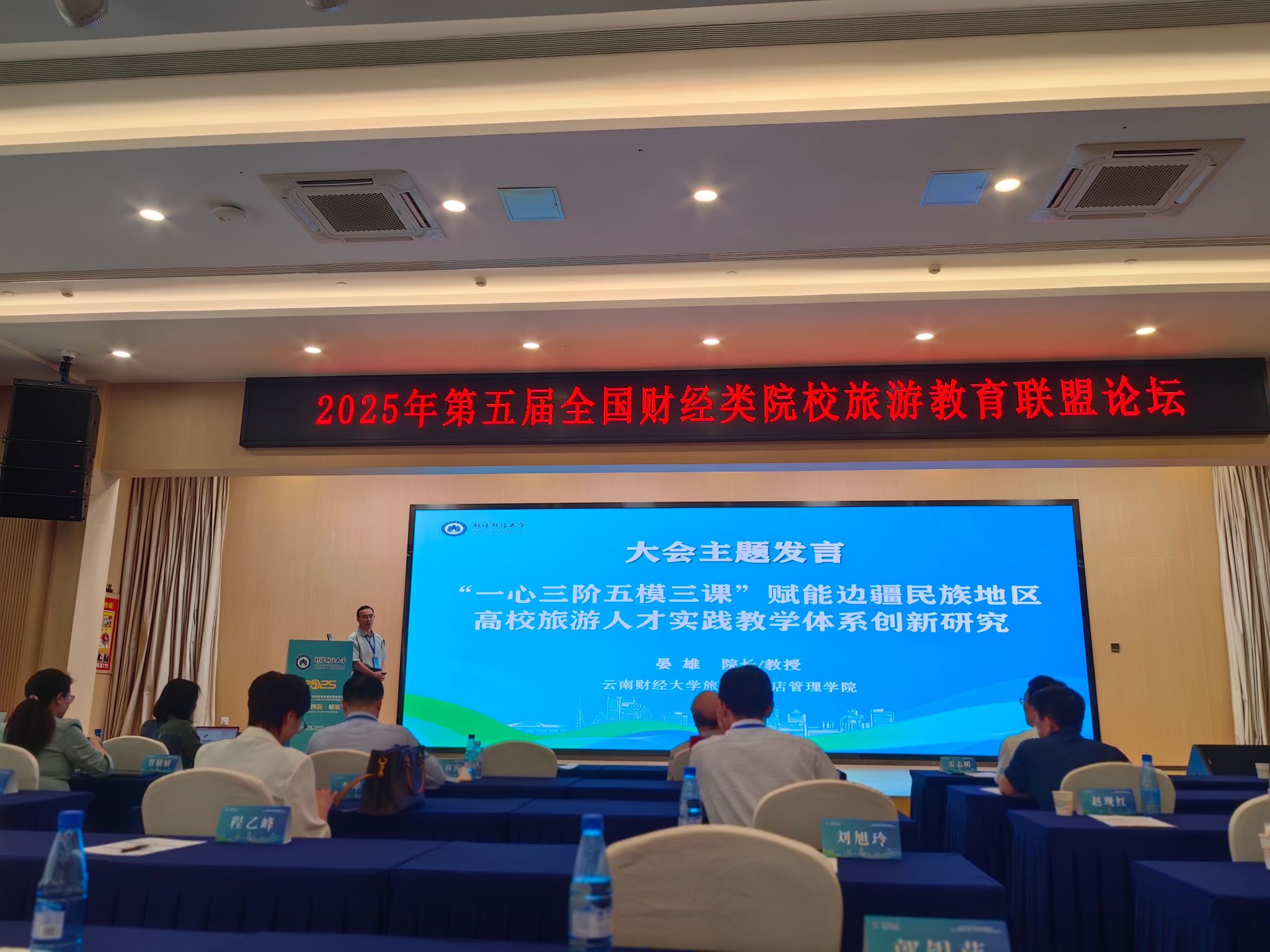 论坛上,晏雄进行了题为《“一心三阶五模三课”赋能边疆民族地区高校旅游人才实践教学体系创新研究》的主题发言,围绕边疆民族地区高校旅游人才培养体系的特色优势及创新范式展开深入探讨,结合我校多维度实践育人体系、民族团结进步示范创建及“全空间、无国界”校企协同育人模式等分享了旅游教育领域的实践经验,为财经类院校旅游人才培养提供了新思路和新观点,引发与会者的广泛共鸣。