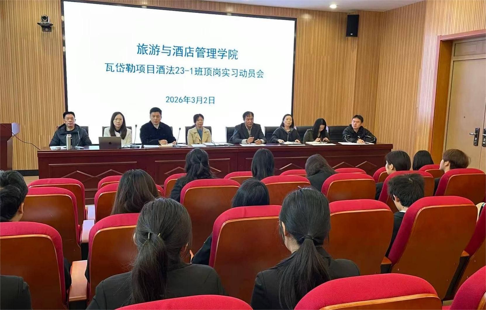 为保障中法瓦岱勒项目23级学生顶岗实习顺利推进,进一步提升学院酒店管理专业国际化办学质量。2026年3月2日上午,旅游与酒店管理学院举行酒法23-1班顶岗实习动员会,学院党委副书记兼纪委书记李永祥、副院长王智慧、副院长韩剑磊出席动员会,学院各科室负责人以及酒法23-1班全体学生参会。
