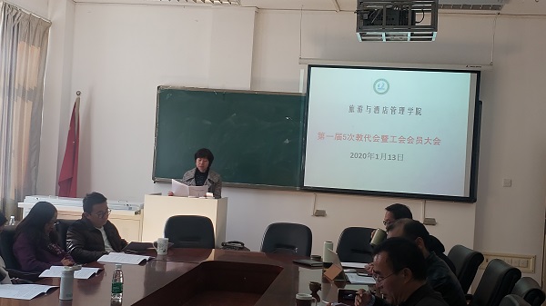 2020年1月13日下午,旅游与酒店管理学院召开一届5次教代会暨工会会员大会,学院全体教职工参加大会,大会由副院长谢洪忠主持。