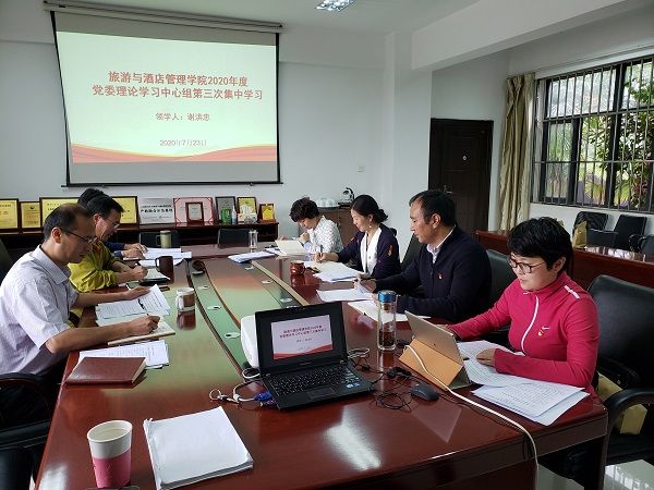 7月23日上午,旅游与酒店管理学院党委理论学习中心组举行2020年第3次集中学习,专题学习坚持党对经济工作的集中统一领导以及新发展理念的深刻内涵。学院全体党委委员参加学习,由张向英同志主持,谢洪忠同志领学。