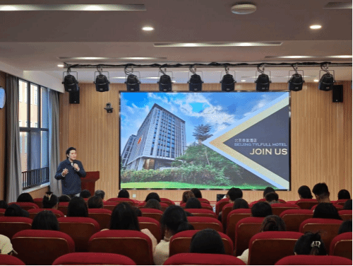 座谈会后,校企双方在齐远楼220学院报告厅开展实习就业集中推荐宣讲会。宣讲会共有70余名毕业生参会,现场气氛热烈,北京泰富酒店行政人事助理杨鹏则重点介绍了酒店行业对于管理和服务人才的高标准,希望能选拔出适合酒店发展的优秀毕业生。云南行走时光文化传播有限公司作为在旅游文化传播领域颇具影响力的企业,总经理王阅表示,希望通过此次机会,能找到具有创新思维和文化传播热情的学生,为公司注入新的活力。链上智游(云南)文旅发展有限公司董事长姜凌指出,随着文旅行业数字化转型加速,公司急需既懂旅游又懂技术的复合型人才。云南省风情国际旅行社有限公司董事长倪舸强调了公司对旅游专业知识扎实、具备良好沟通能力和服务意识的人才的迫切需求。各企业均表示要积极开拓岗位为毕业生就业提供优质资源,确保毕业生留得住、能发展。同学们积极应聘,兴趣盎然。推介会为2025届毕业生带来了丰富的实习和就业资源,参会同学与企业现场咨询并达成就业意向。本次活动实现了就业岗位拓展与毕业生就业需求的有效衔接,增强了工作实效。