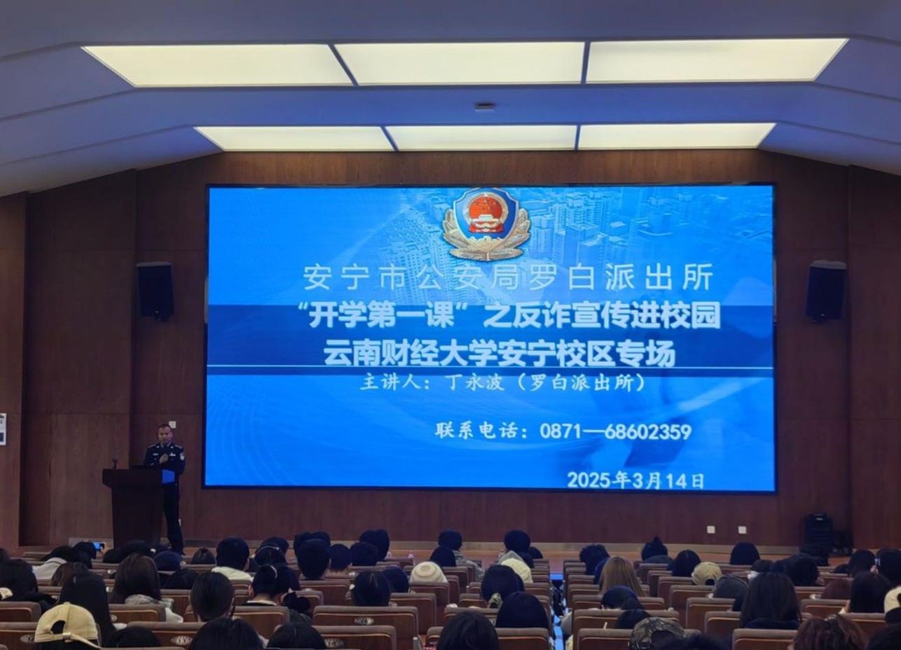 为加强防范网络电信诈骗的宣传教育,提升大学生防诈意识和法治素养,旅游与酒店管理学院于3月14日中午在鹏云一附101报告厅举行反诈宣传进校园活动。安宁市罗白派出所所长丁永波、安宁校区保卫科科长郑波、学生科科长孙晓琼以及来自各班的安全信息员及宿舍代表共计200余人参加宣讲会。活动由党委副书记李永祥主持。