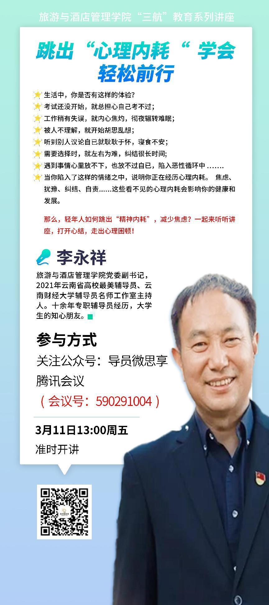 为加强大学生思想和心理建设,促进大学生安全管理。针对当前大学生面对社会竞争、人际交往、疫情防控、社会不确定环境变化等因素导致的一些大学生心理脆弱、思想心理压力太,精神紧绷的情况。3月11日下午,旅游与酒店管理学院在齐远楼220报告厅举行“跳出心理内耗,轻松成长”讲座。学院党委副书记、学校辅导员名师工作室主持人李永祥担任主讲。讲座采用线上方式, 400余名同学参加了空中课堂辅导。