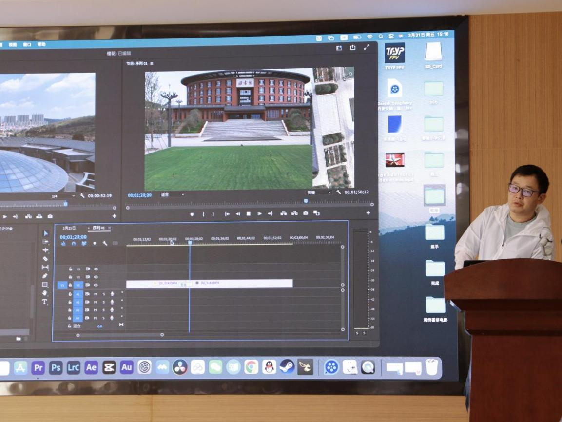 沈泉从确定拍摄主题、选择器材、特效使用、常用剪辑软件等方面进行了讲解。他结合自己拍摄创作的短视频素材,讲述了展示主题的方式方法,并以手机拍摄为例,介绍了拍摄参数的设置、功能的选择、构图技巧、特写与光影技巧等内容。他还现场操作Pr、剪映等视频剪辑软件,从素材导入、特效使用、剪辑编排等方面做了演示。同学听得认真,学得专心,对剪辑视频产生了浓厚的兴趣。
