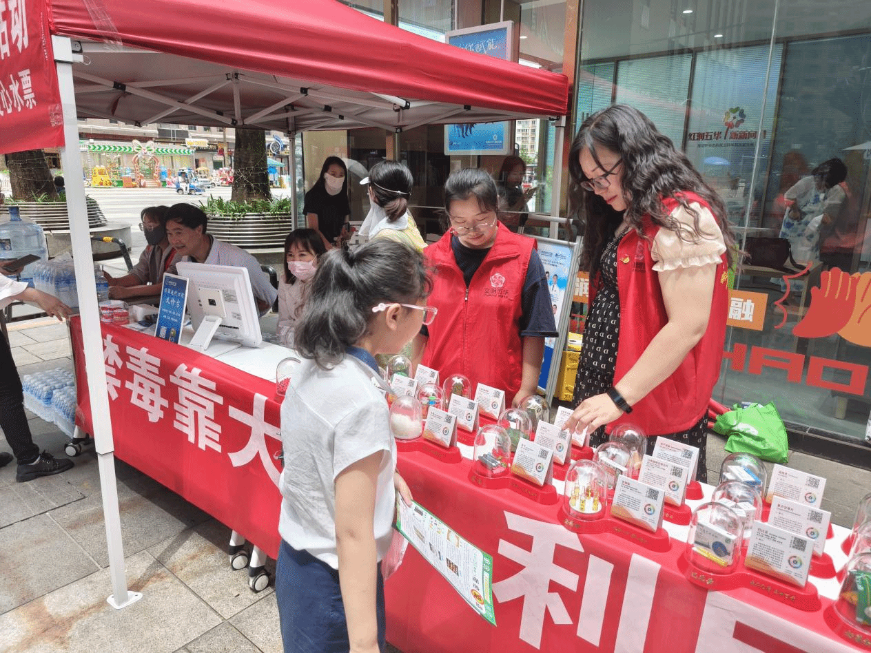 为提高公众对毒品危害的认识,增强禁毒、拒毒、防毒意识,7月30日,旅游与酒店管理学院“同心向党,红船启航”志愿服务队携手五华区红云云锦社区在昆明和谐广场开展了以“禁毒靠大家,利民利国家”为主题的禁毒知识宣传活动。