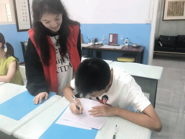 在普通话学习和推广活动中,实践队员面向书画院孩子们详细讲解了普通话的发音规范、声调特点及其在日常生活中的重要性,并带领大家进行普通话练习,孩子们积极参与,认真学习,现场气氛活跃。在书法活动环节,实践队邀请专业书法教师杨世堂为实践队与孩子们讲解书法,从字体结构再到笔画走势,杨世堂用通俗易懂的方法为全体学员深入讲解了书法要义。随后,孩子们进行书法创作,实践队队员和助教老师从握笔姿势、运笔诀窍等方面对他们进行悉心指导,孩子们全神贯注,沉浸在书法的世界中。