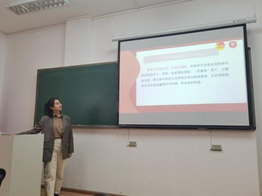 赵玥通过“感恩”、“爱”、“思考”、“成长”、“满足”五个角度切入主题,从自己作为团学骨干的经验谈论青年学生如何努力践行听党话,跟党走。另一方面,她向学院学生骨干传达了中华全国学生联合会第二十七次代表大会精神,并对大会的概况进行了简要介绍;其次,对习近平总书记给全国青联学联的贺信及其精神进行分享,在全体学员中引起强烈共鸣;最后,对新时代学联的根本遵循、主要任务、奋斗目标和改革措施进行分享,指出当代青年要坚持中国共产党的领导,要坚定理想信念,勇于开拓创新,在新时代中不断奋进。