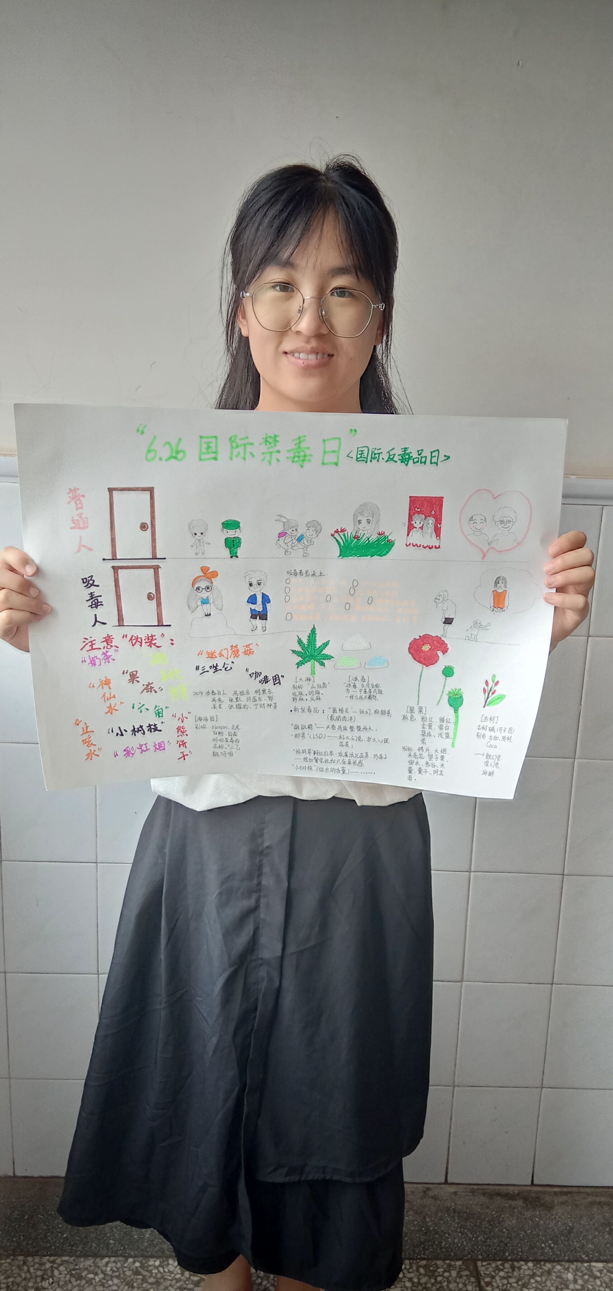 14:30,活动正式开始,分为禁毒知识竞答和主题手抄报两部分。首先,由负责人将禁毒知识竞赛问卷发放在提前建立好的QQ群里,让同学们及时进行问卷答题,在答题过程中学习到更多的禁毒知识;本环节根据问卷成绩的高低来发放相应的二课积分。之后,同学们将自己制作的手抄报的过程和成品以图片或视频的形式交于负责人;由宣传部进行作品合辑。参与者在制作的过程中对禁毒知识有了更加深入的了解,手抄报也起到了让更多同学认识毒品危害的宣传作用。