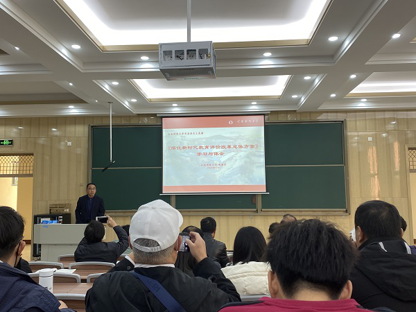 2020年10月23日下午,副校长胡海彦在太平校区“鹏云楼”报告厅为旅游与酒店管理学院、城市与环境学院和基建处三个单位全体教职工党员讲授专题党课。此次专题党课胡海彦副校长对中共中央、国务院印发《深化新时代教育评价改革总体方案》进行了深入浅出的专题讲解。胡海彦副校长指出《总体方案》是一份教育评价改革的系统性文件,是深化教育评价改革的纲领性文件。他勉励全体教职工要认真学习《深化新时代教育评价改革总体方案》精神,确保方案中各项改革部署落得准、落得稳、落得好。全体教职工党员要增强新时代教育评价改革的责任感、使命感和紧迫感。胡海彦副校长在专题党课上与教职工党员们分享了他对《总体方案》重点领域、关键环节和主攻方向的认识,并与现在高等教育评价工作存在问题进行对比鼓励大家思考今后一段时间我们高等教育评价要改什么怎么改,如何才能找准高等教育评价推进路径工作方法。同时鼓励大家围绕教育评价新导向,进一步树立教书育人的信心,认真践行师德师风要求,规范教育教学行为,践行“四有”好老师标准, 做新时代学生引路人。